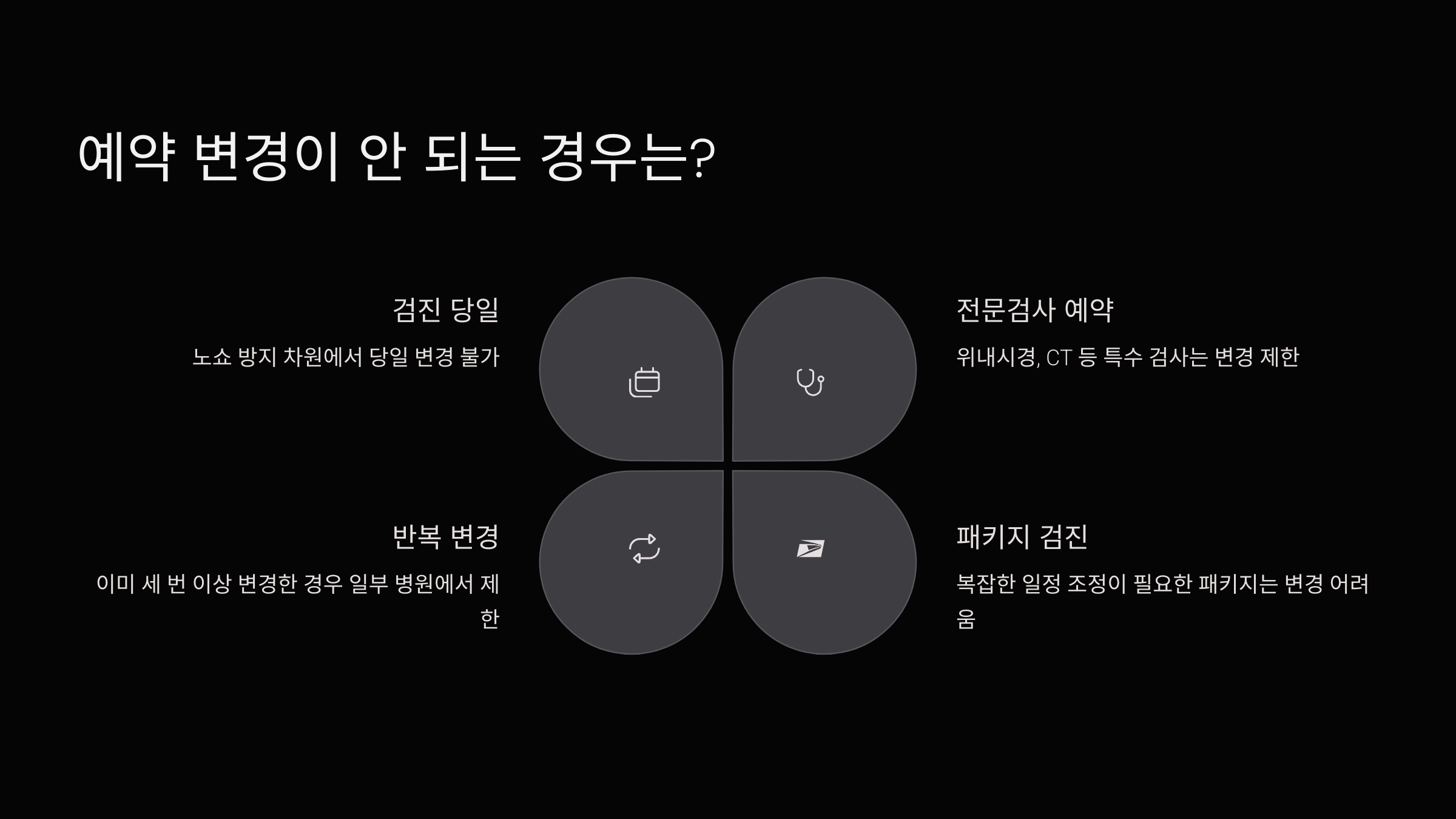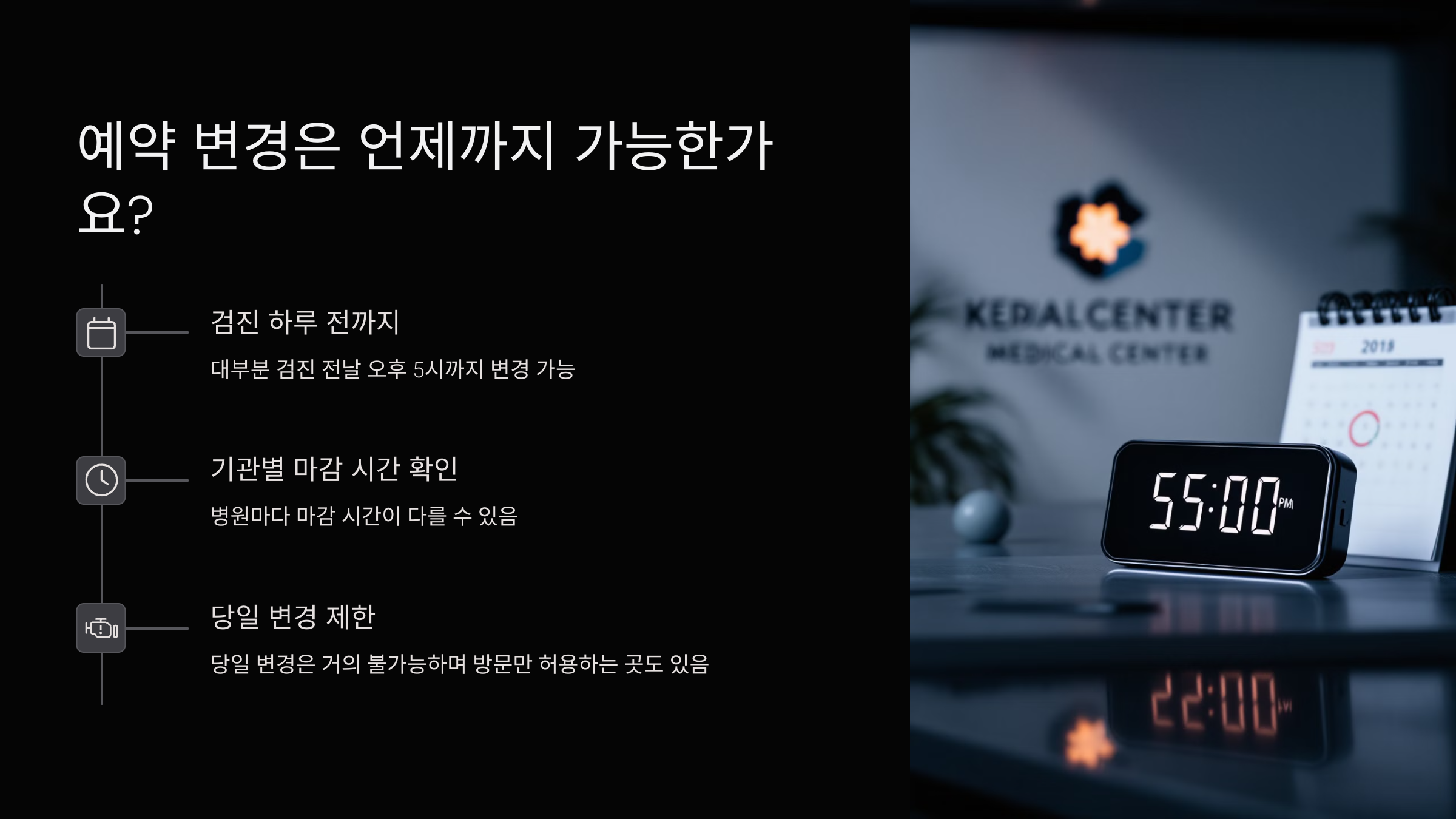 건강검진 예약 변경은 병원마다 마감 시간이 달라요. 대부분 검진 하루 전까지는 변경이 가능하지만, 아래 표를 참고하면 더 정확해요.