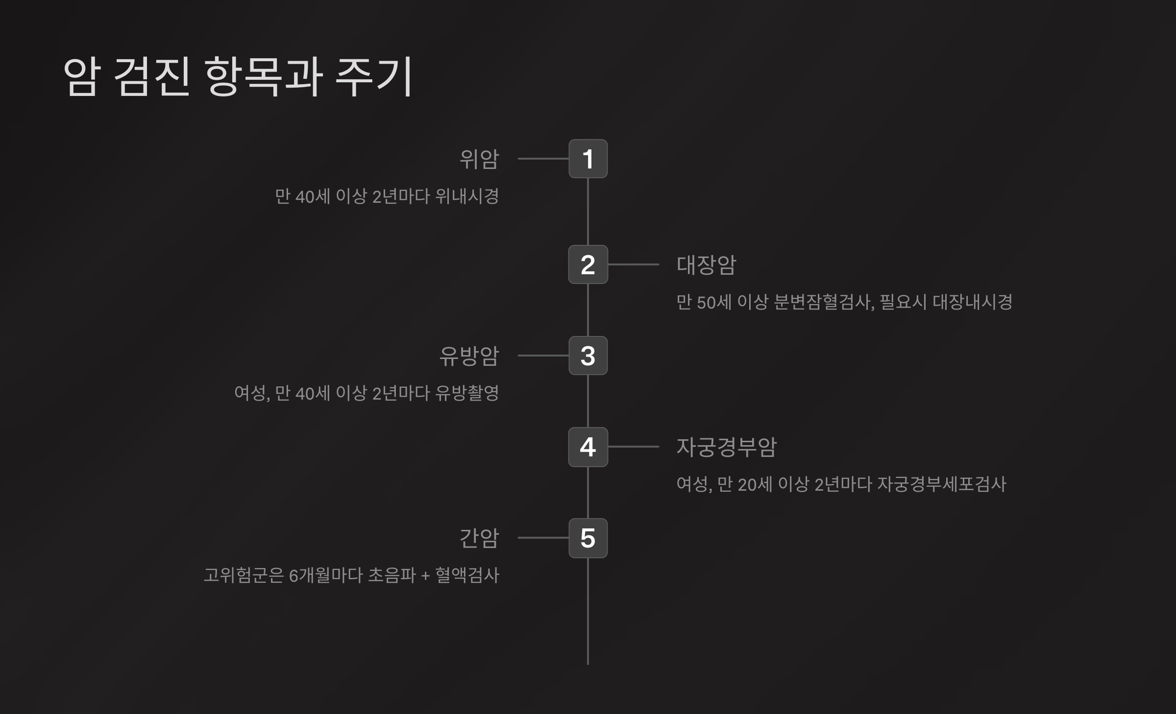 위내시경 (2년마다), 대장암 검사 (분변+내시경), 유방암/자궁경부암 (여성)
