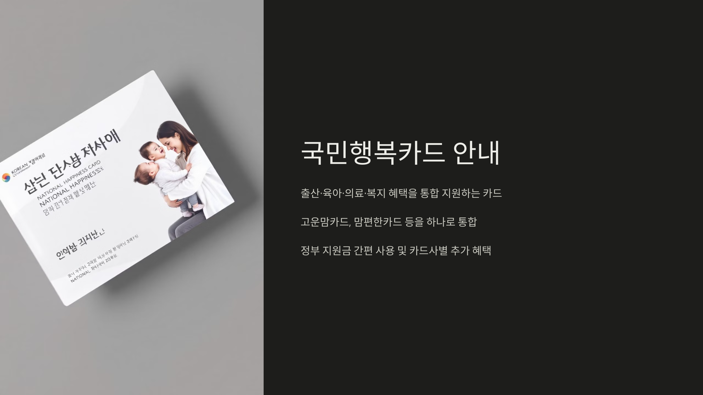 국민행복카드는 정부에서 제공하는 다양한 복지 혜택을 하나의 카드로 통합하여 사용할 수 있도록 만든 제도예요. 출산, 보육, 의료비 지원 등 여러 가지 복지 혜택을 받을 수 있어요.