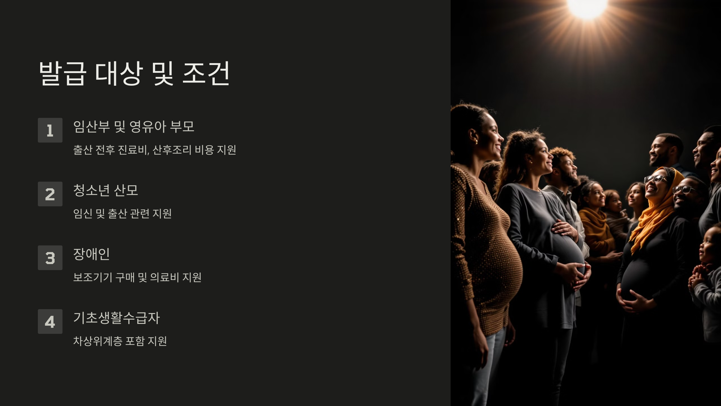 | 임산부 | 출산 전후 진료비, 산후조리 비용 지원 |