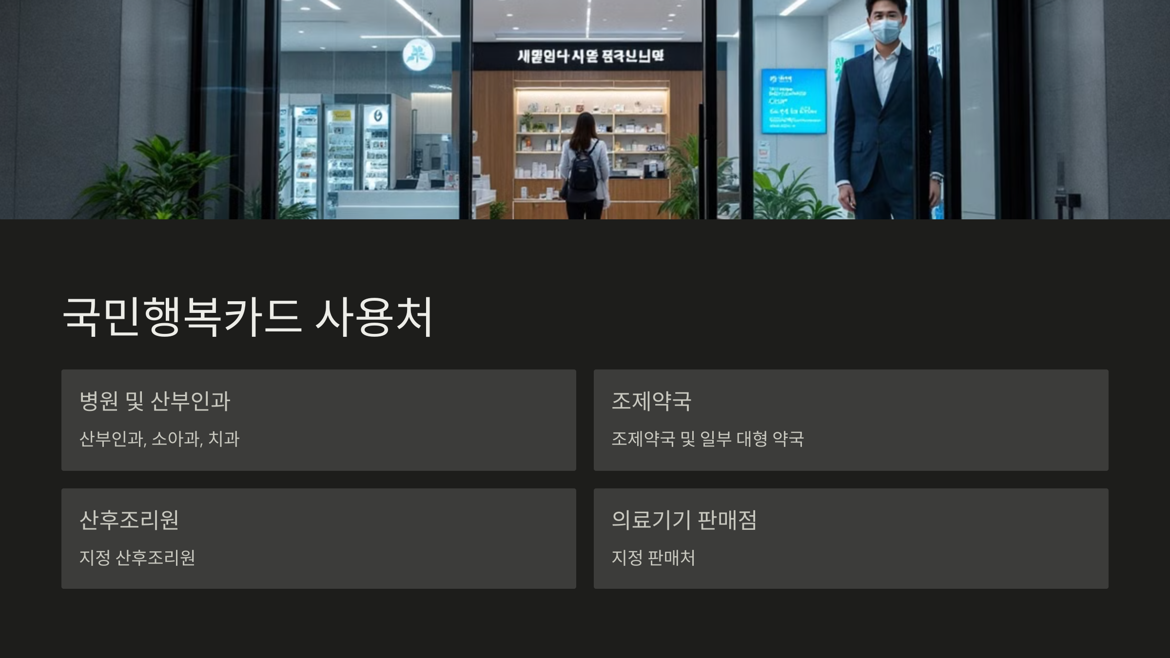 국민행복카드는 지정된 병원, 약국, 산후조리원 등에서 사용할 수 있어요. 또한 일부 온라인 쇼핑몰에서도 이용할 수 있답니다.
