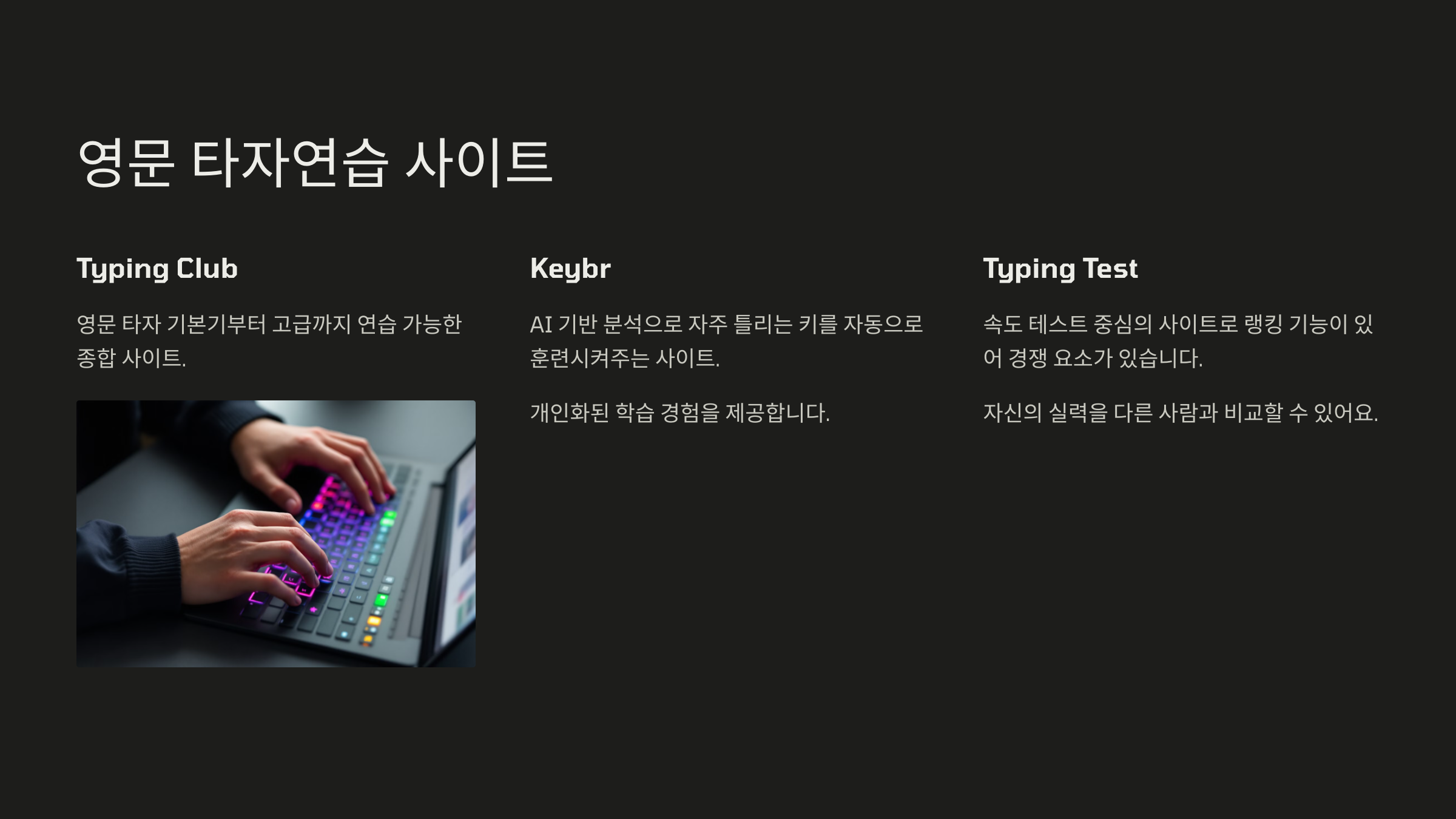 타자 실력은 하루아침에 좋아지지 않아요. 꾸준한 연습이 중요한데, 요즘은 굳이 프로그램을 설치하지 않아도 웹에서 바로 연습할 수 있는 사이트들이 정말 많아요.