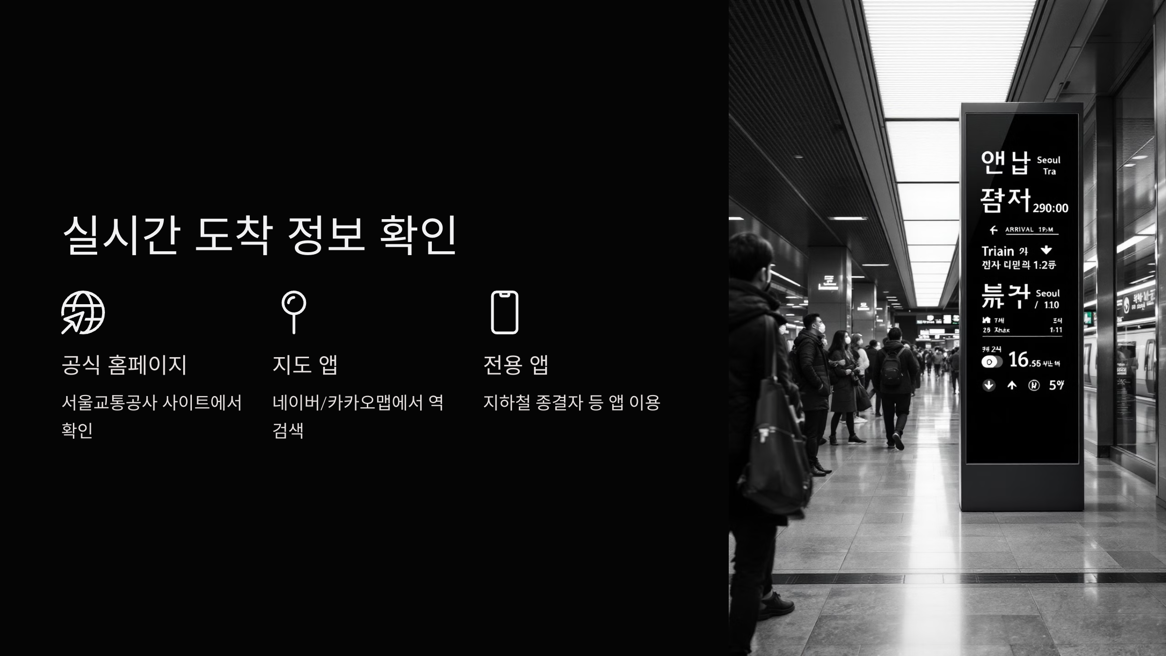 A3. 네이버 지도, 카카오맵, 서울교통공사 홈페이지에서 실시간 도착 정보를 확인할 수 있어요. "지하철 종결자" 같은 모바일 앱도 유용해요.