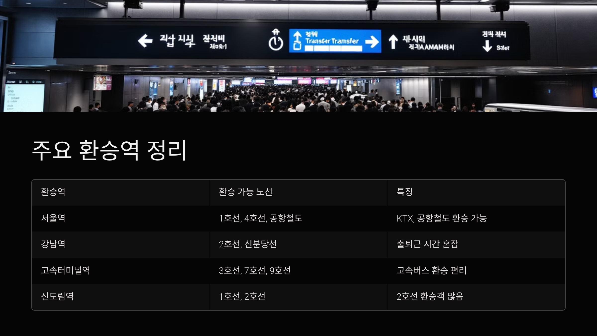 | 서울역 | 1호선, 4호선, 공항철도 | KTX, 공항철도 환승 가능 |