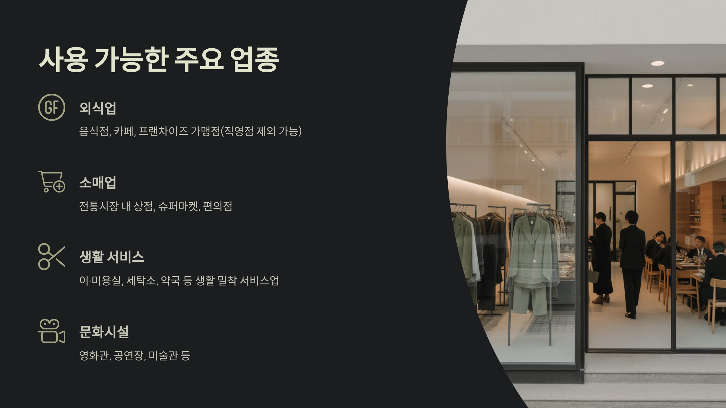 문화시설(영화관, 공연장, 미술관 등)도 해당되는 경우가 많습니다.