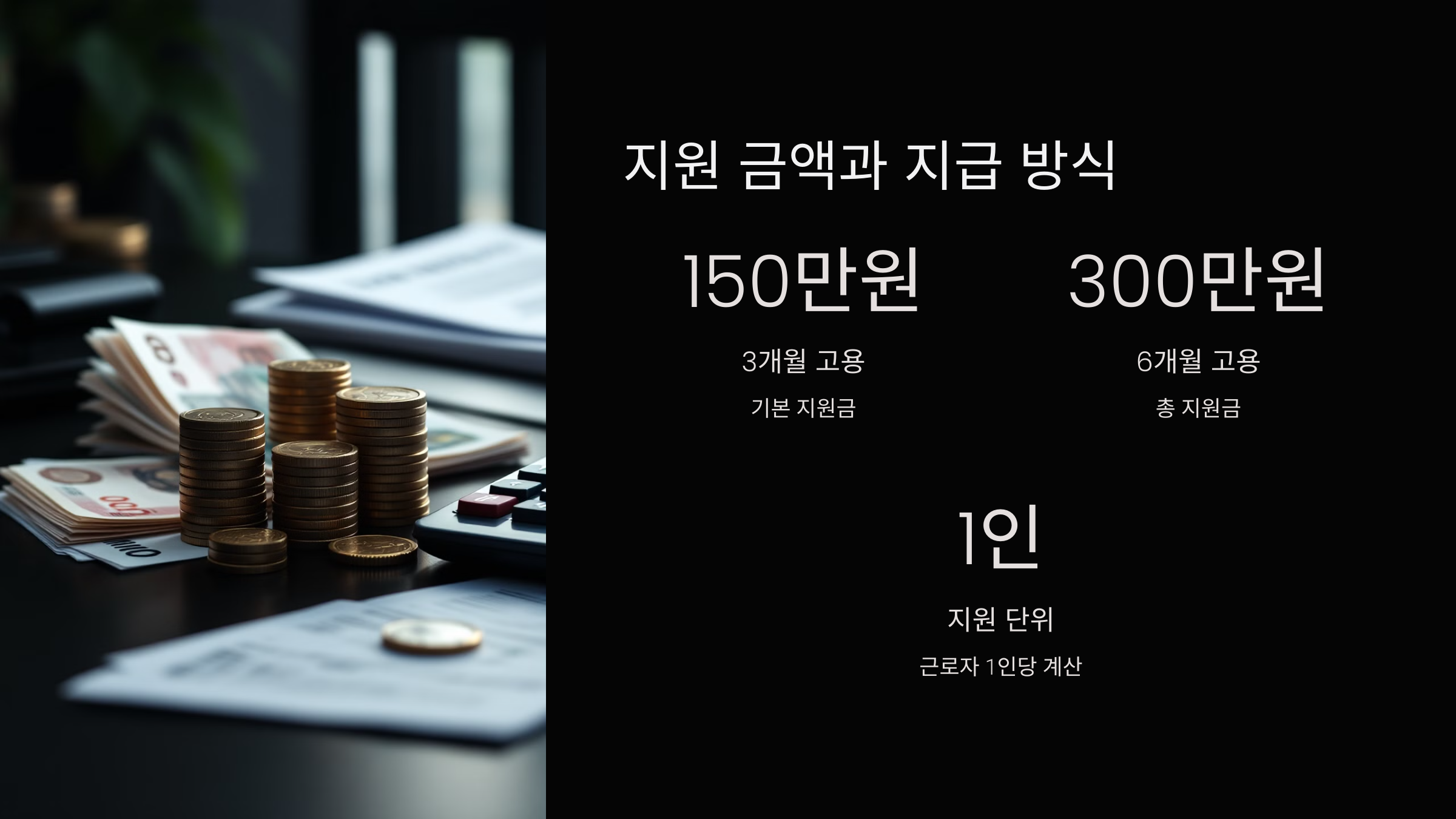 지원금은 근로자 1인당 최대 300만 원까지 지급돼요. 기본 3개월 이상 고용 시 150만 원, 6개월 이상 유지 시 추가로 150만 원이 더해져요.