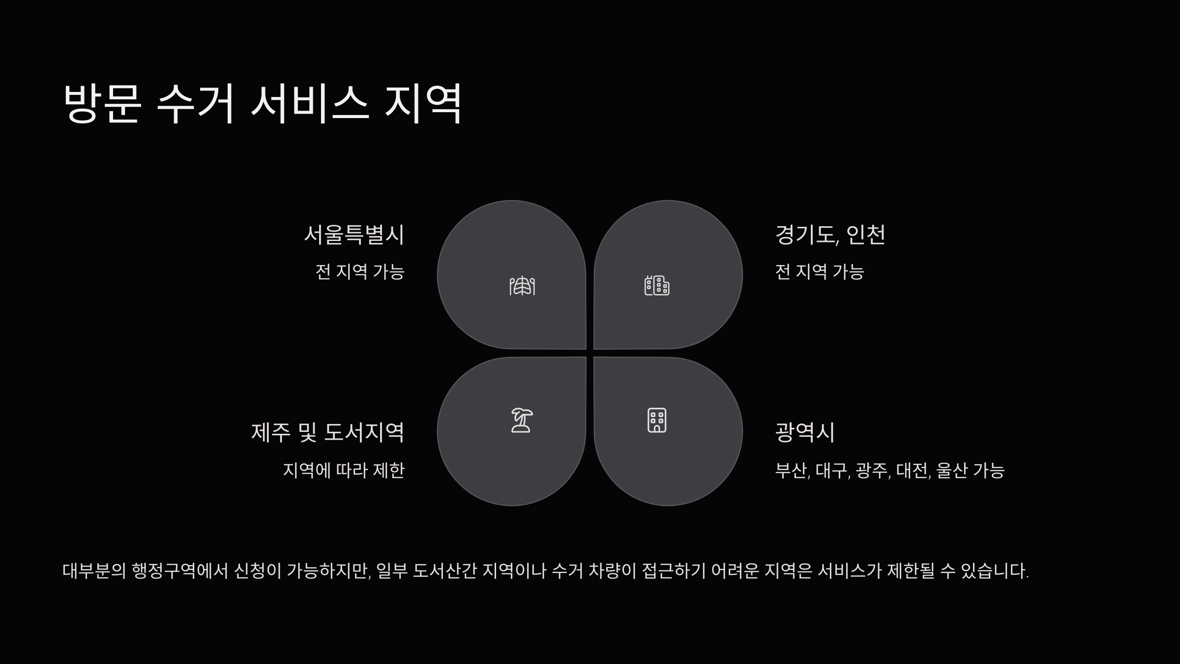 단, 일부 도서산간 지역이나 수거 차량이 접근하기 어려운 지역은 서비스가 제한될 수 있으니, 신청 전 서비스 가능 지역인지 확인하는 것이 좋아요.