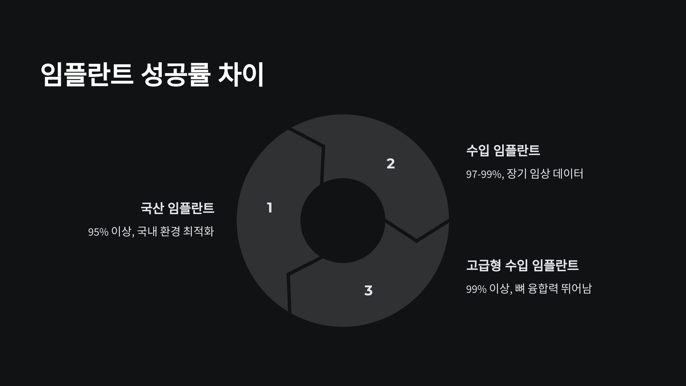 내가 생각했을 때, 성공률이 95% 이상이면 국산도 충분히 좋은 선택이 될 수 있을 것 같아요! 수입 제품이 더 안정적이긴 하지만, 결국 치과의사의 실력과 관리 여부가 더 중요하겠죠?