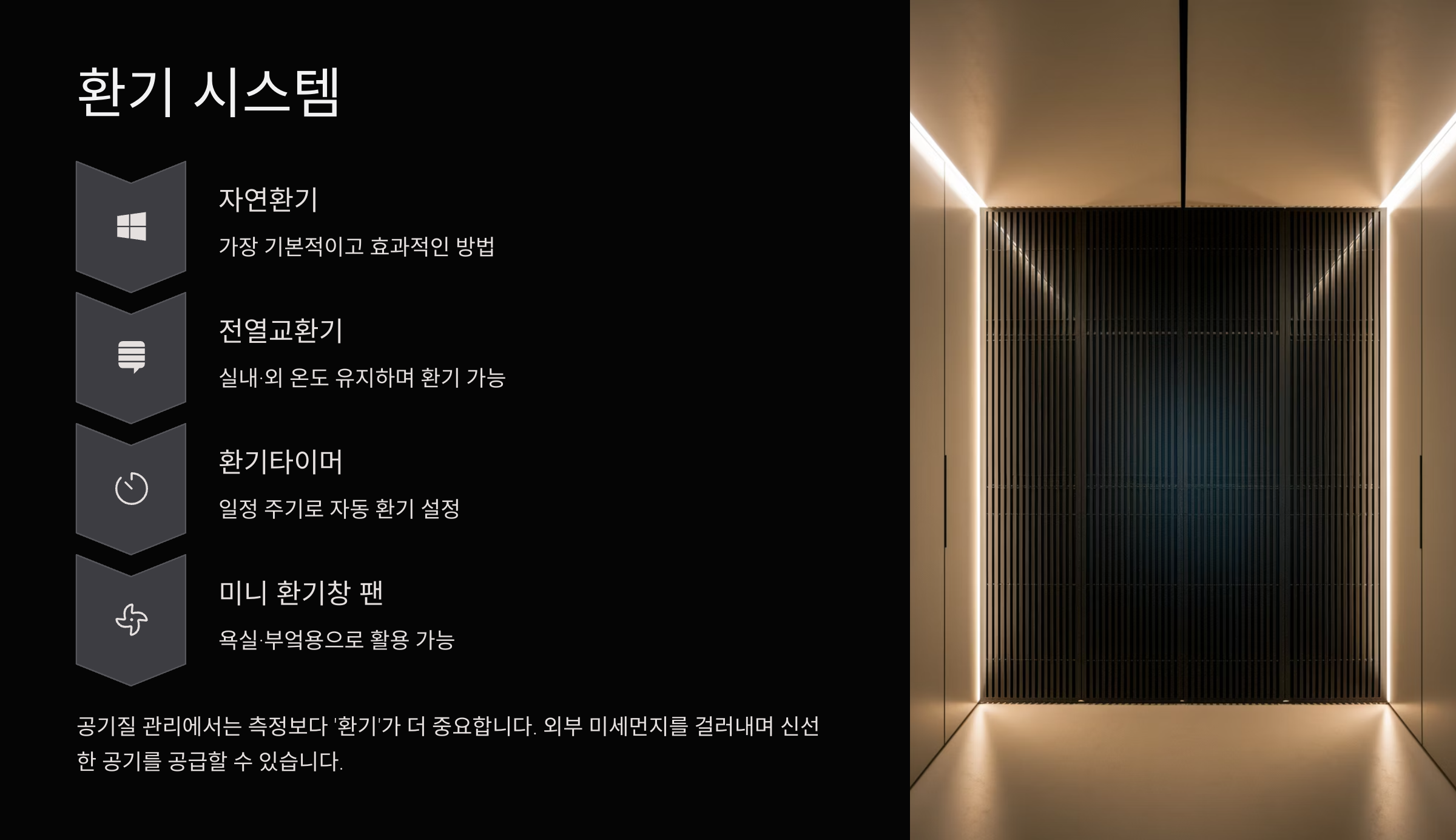 - 전열교환기: 실내·외 온도 유지하며 환기