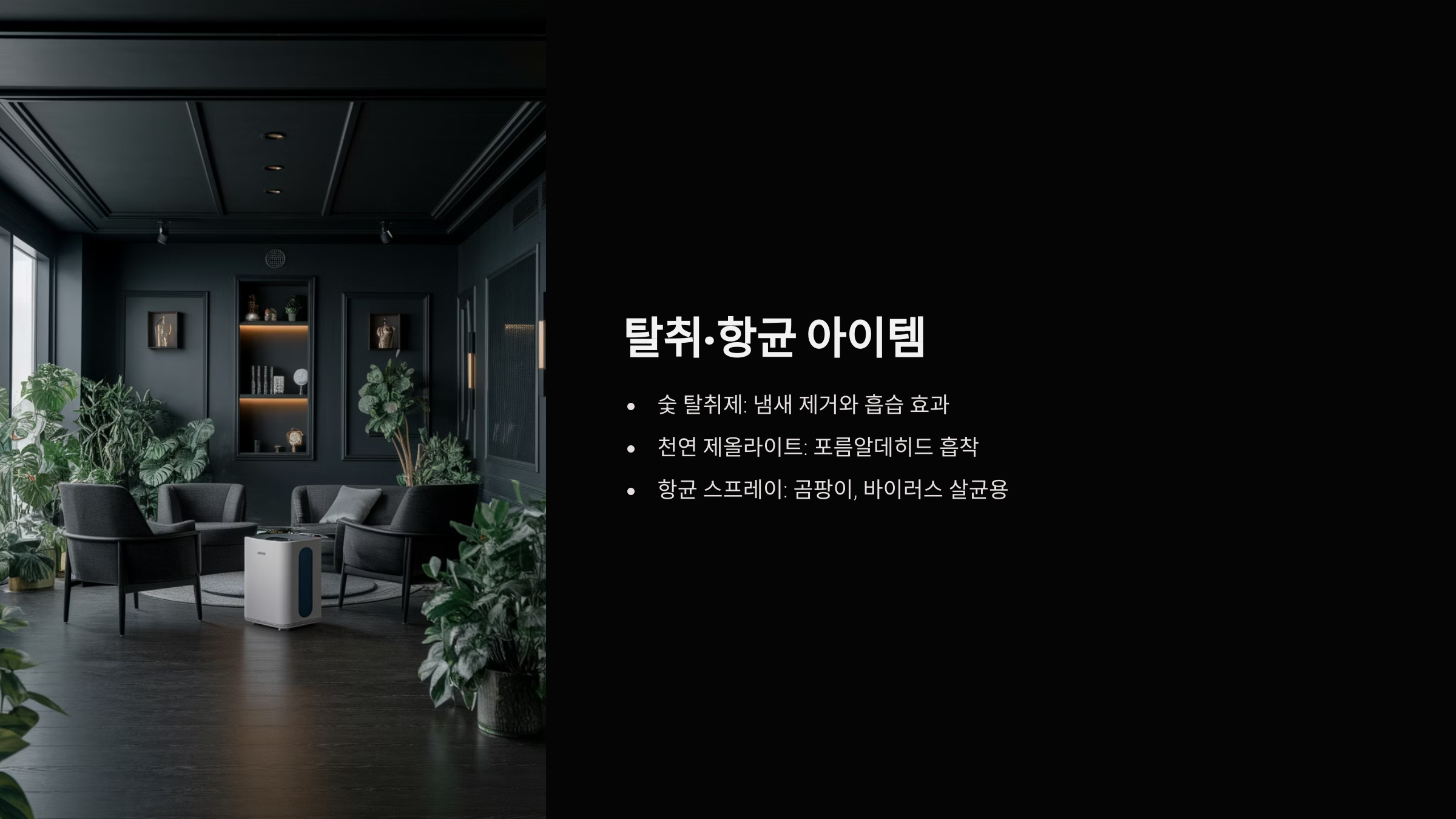 | 공기 정화 | 미세먼지, 유해가스 제거 | 거실, 침실 | 공기청정기, 숯, 제올라이트 |