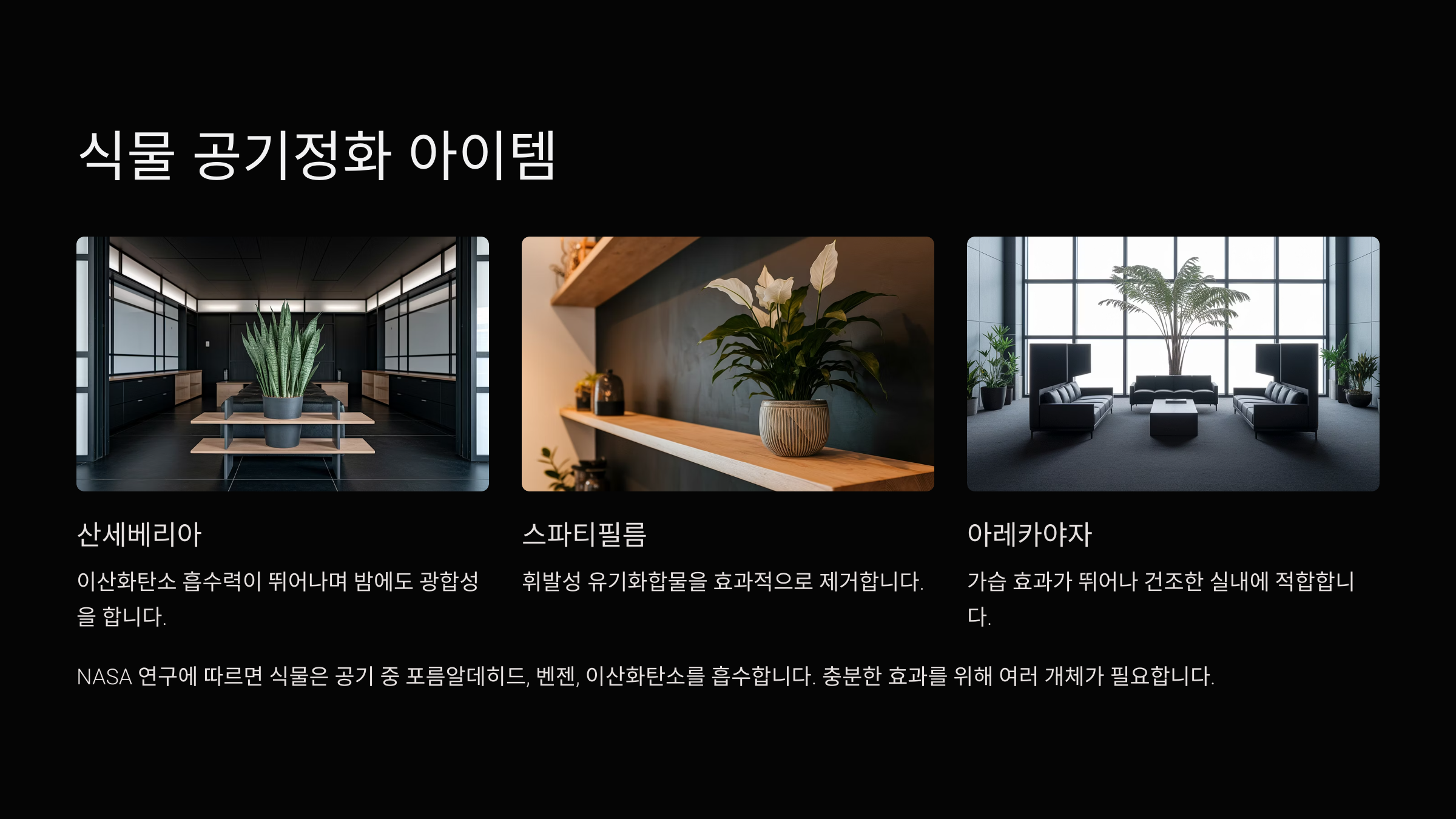 | 자연 정화 | CO2, VOC 흡수 | 창가, 실내 한 켠 | 스파티필름, 산세베리아, 아레카야자 |