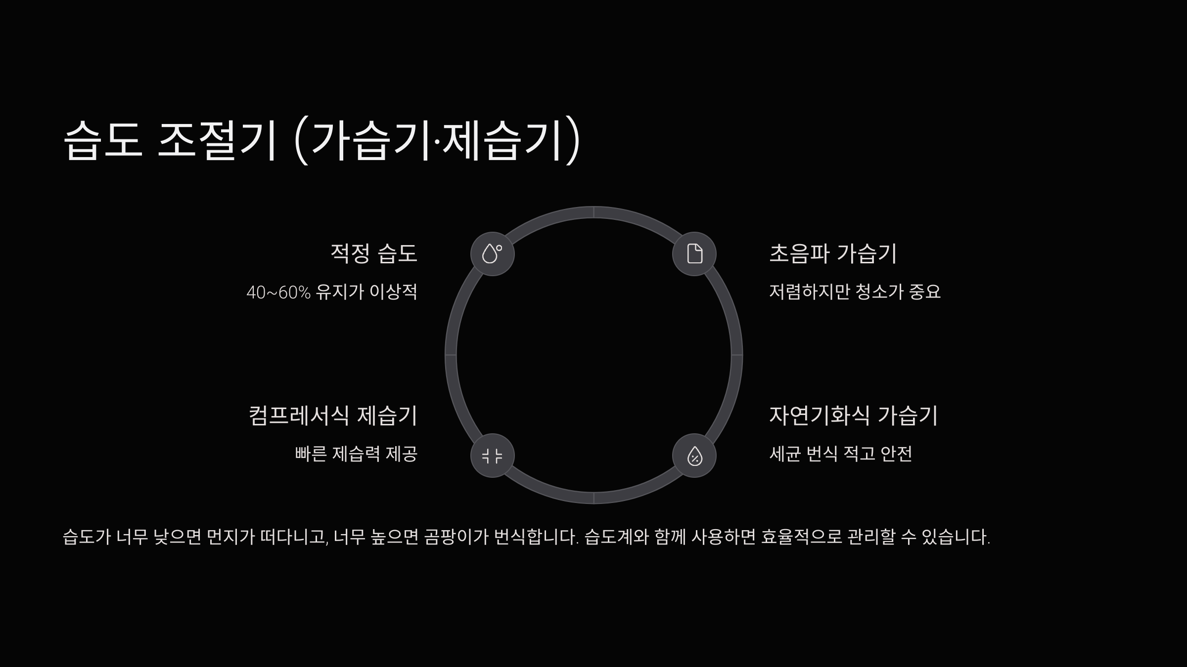 습도가 너무 낮으면 먼지가 공중에 떠다니고, 너무 높으면 곰팡이와 세균이 번식하기 쉬워요. 적정 습도 40~60%를 유지하는 게 좋아요.