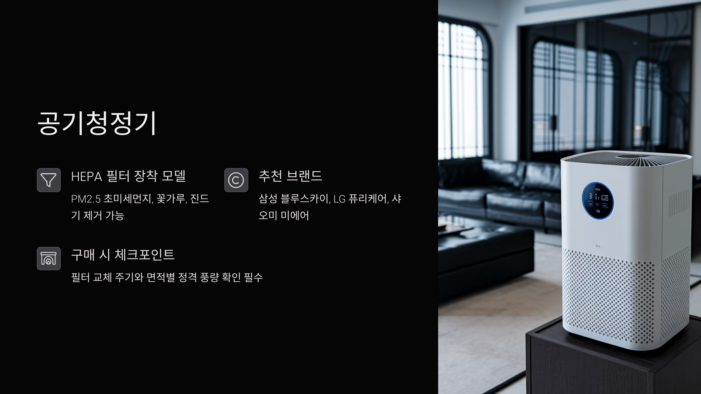 - 추천 브랜드: 삼성 블루스카이, LG 퓨리케어, 샤오미 미에어