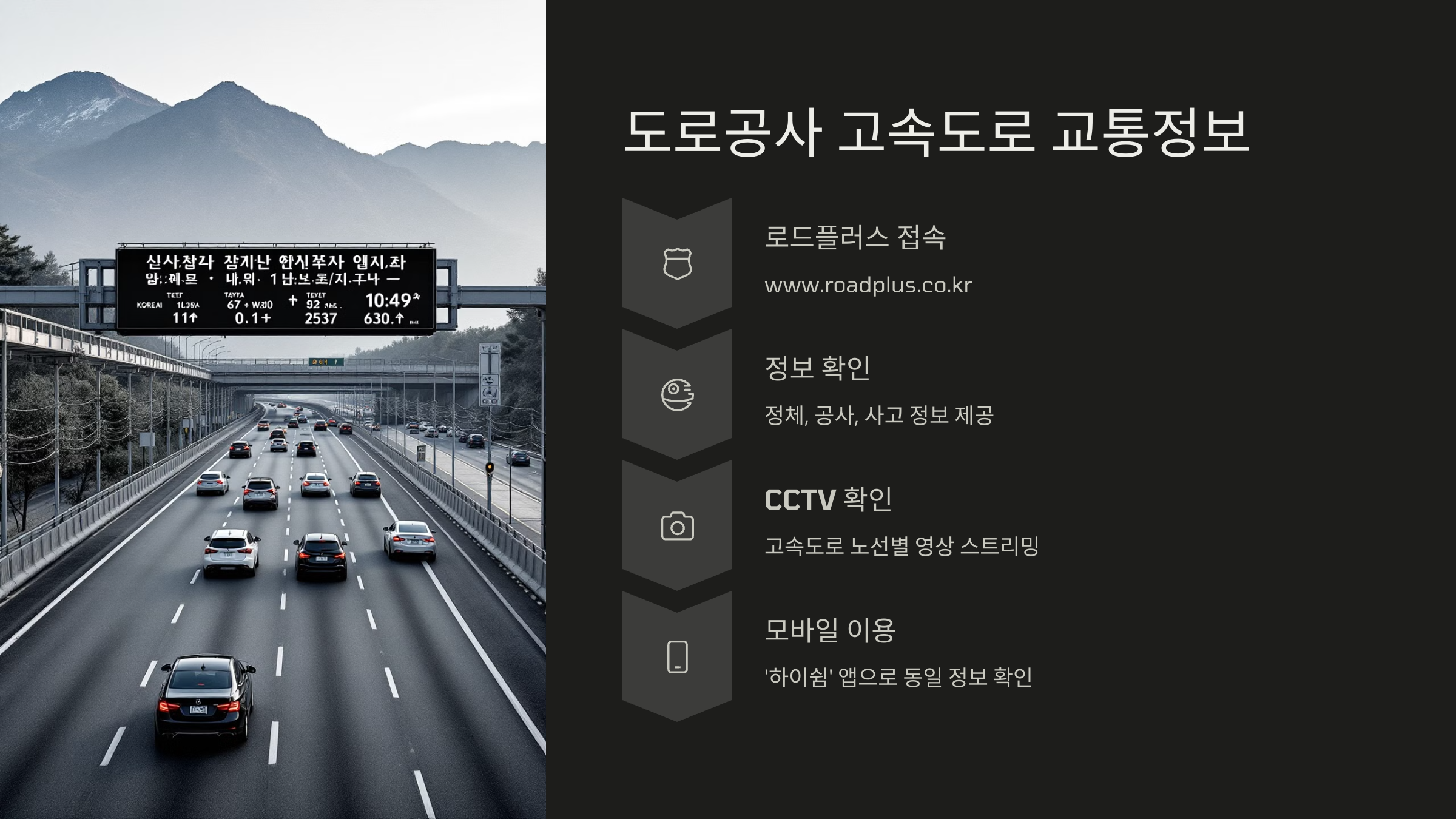 - 내비게이션 없이도 고속도로 정체, 공사 구간, 사고 정보를 확인 가능