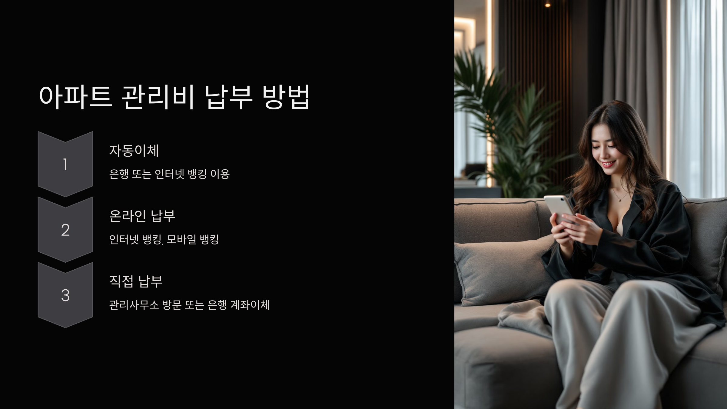 이처럼 관리비 조회 방법이 다양하니, 본인에게 편리한 방식을 선택해 이용하면 돼요. 이제 납부 방법을 알아볼까요.
