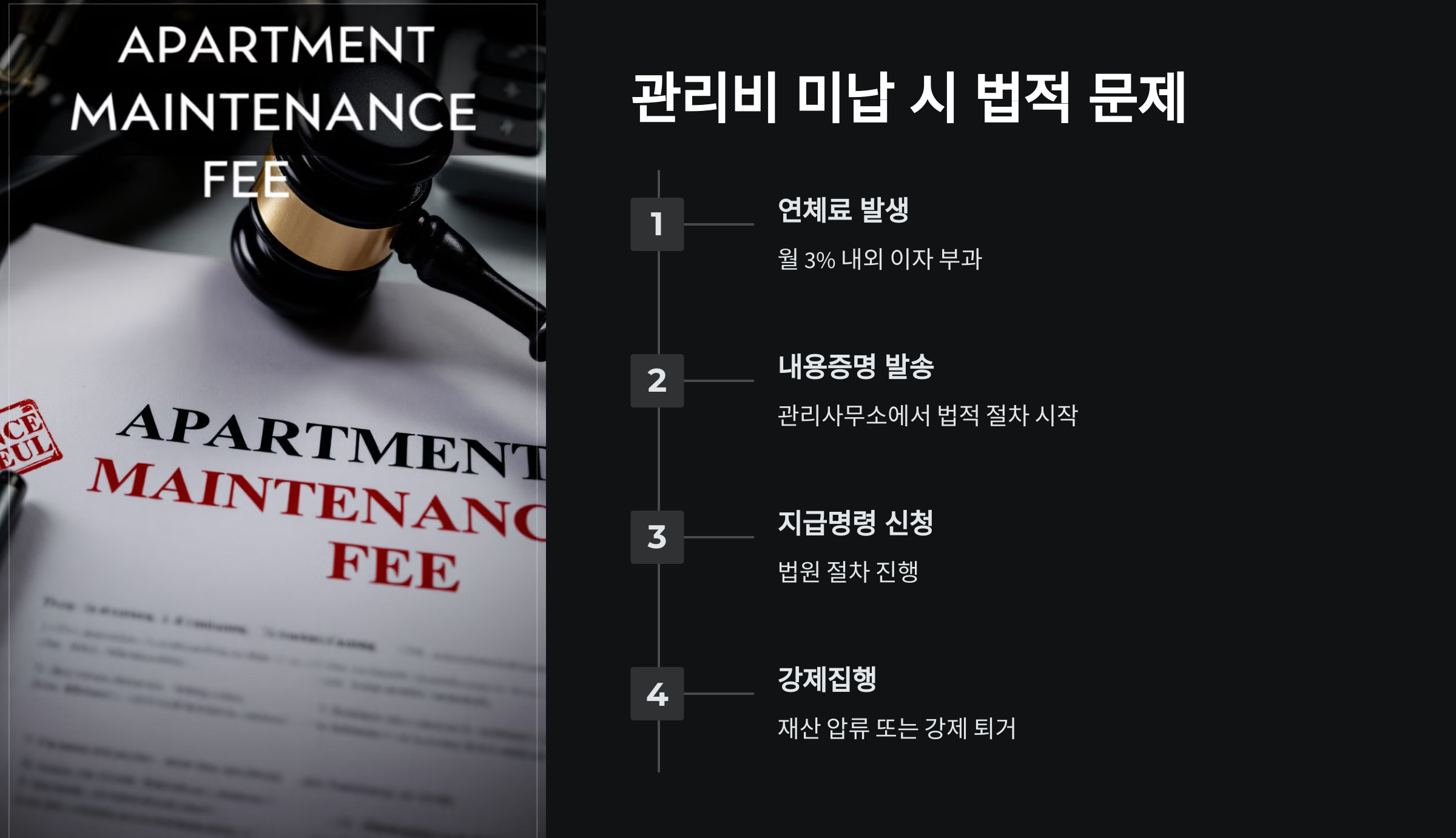 아파트 관리비를 납부하지 않으면 다양한 법적 문제가 발생할 수 있어요. 단순히 연체료가 부과되는 것뿐만 아니라, 심할 경우 법적 소송으로 이어질 수도 있어요.