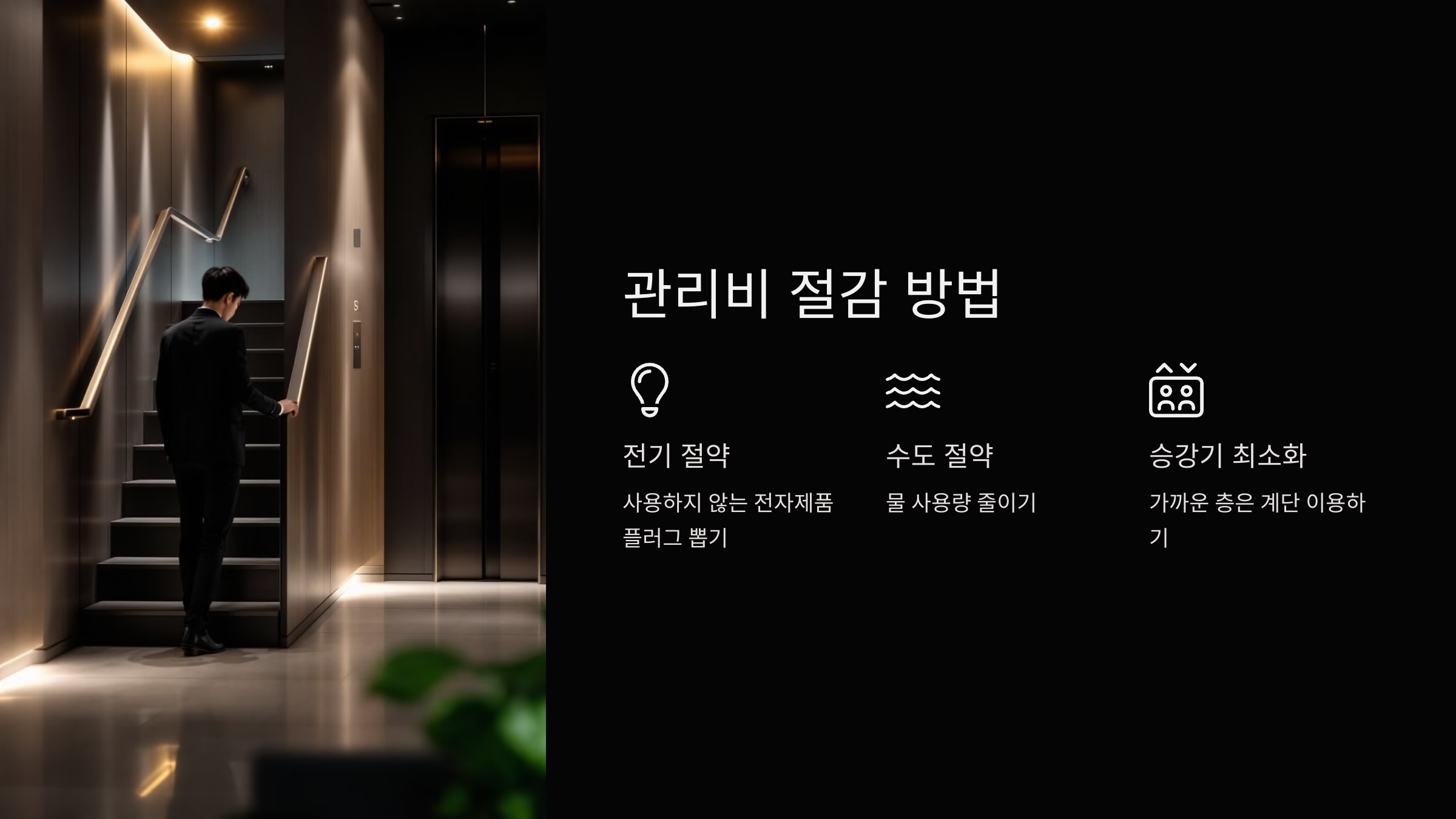 개별적으로는 전기·수도·가스를 절약하는 것이 중요해요. 사용하지 않는 전기 코드를 뽑거나, 물을 절약하는 샤워 습관을 들이면 관리비를 줄일 수 있어요.
