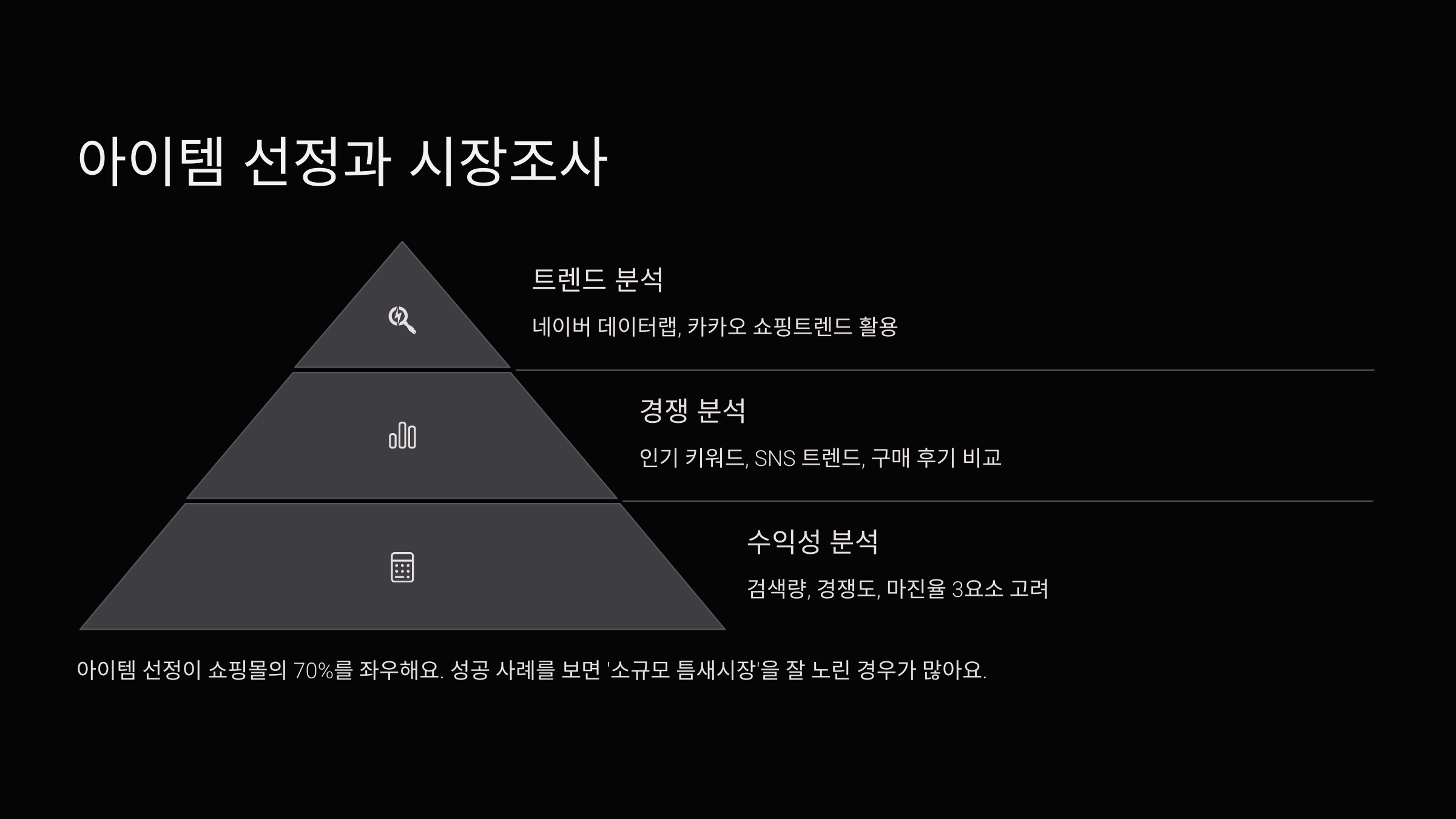 아이템 선정이 쇼핑몰의 70%를 좌우한다고 해도 과언이 아니에요. 성공 사례를 보면 ‘소규모 틈새시장’을 잘 노린 경우가 많아요.