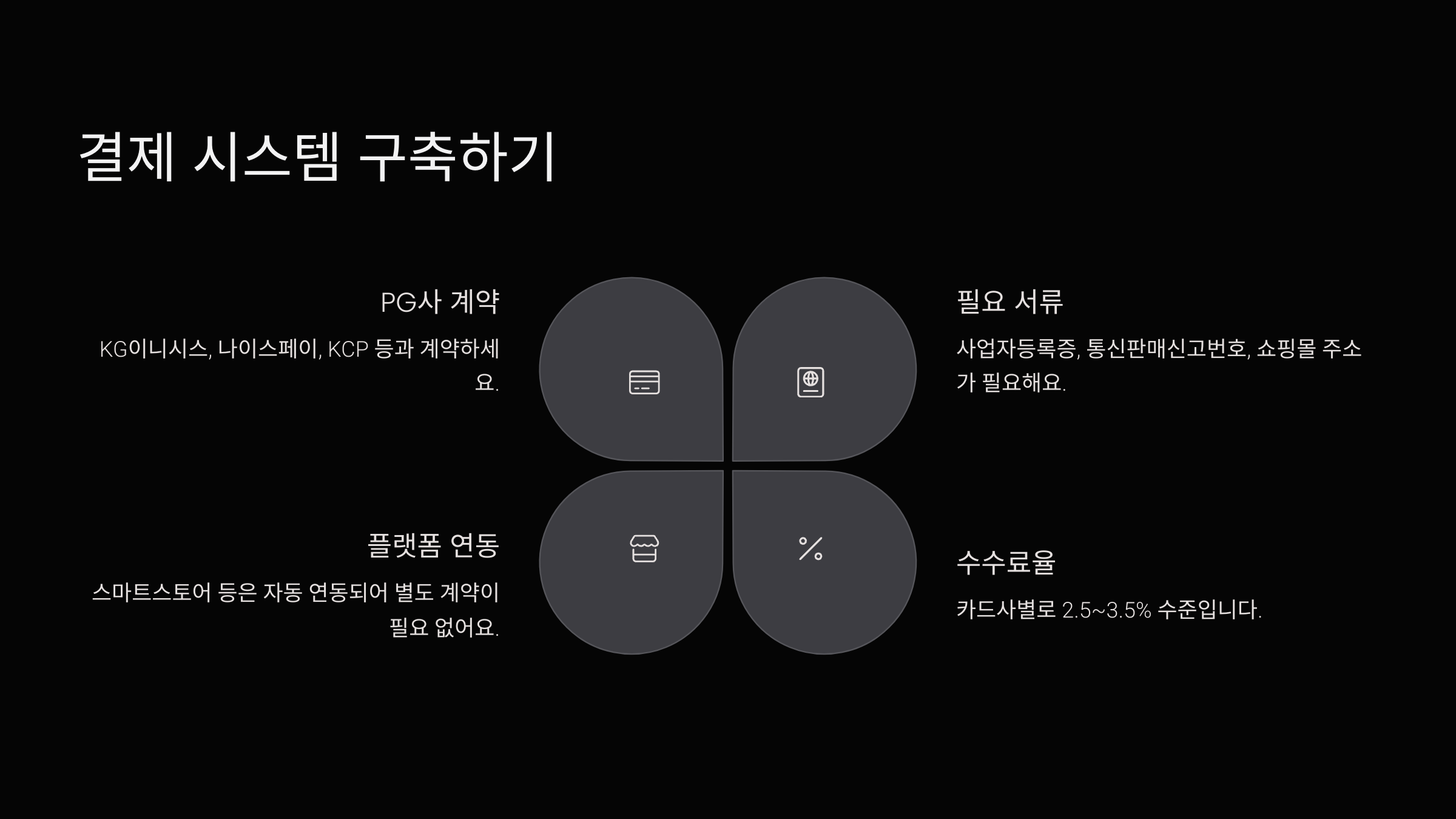 PG사(Payment Gateway)와 계약해서 카드결제, 간편 결제를 받을 수 있게 해야 해요.