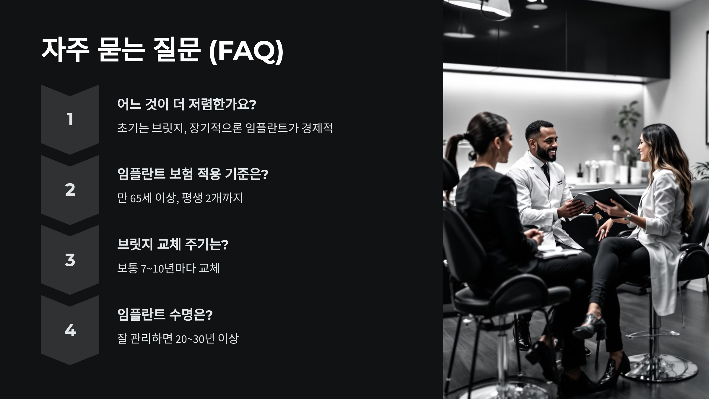 A1. 초기 비용은 브릿지가 저렴하지만, 장기적으로 보면 임플란트가 더 경제적일 수 있어요.