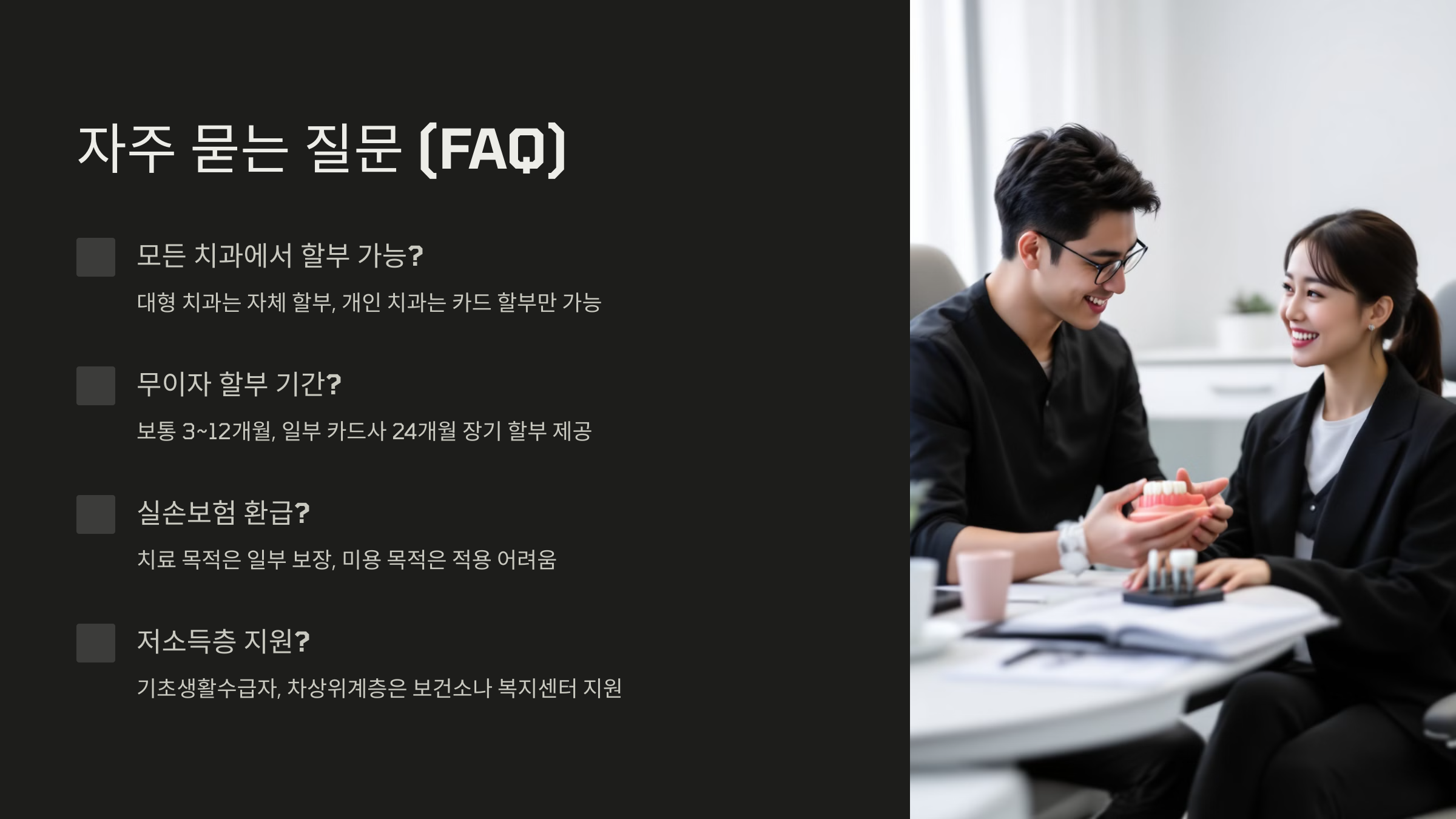 A1. 아니요. 대형 치과는 자체 할부 프로그램이 있지만, 개인 치과는 카드사 무이자 할부만 가능할 수 있어요. 방문 전 확인이 필요해요.