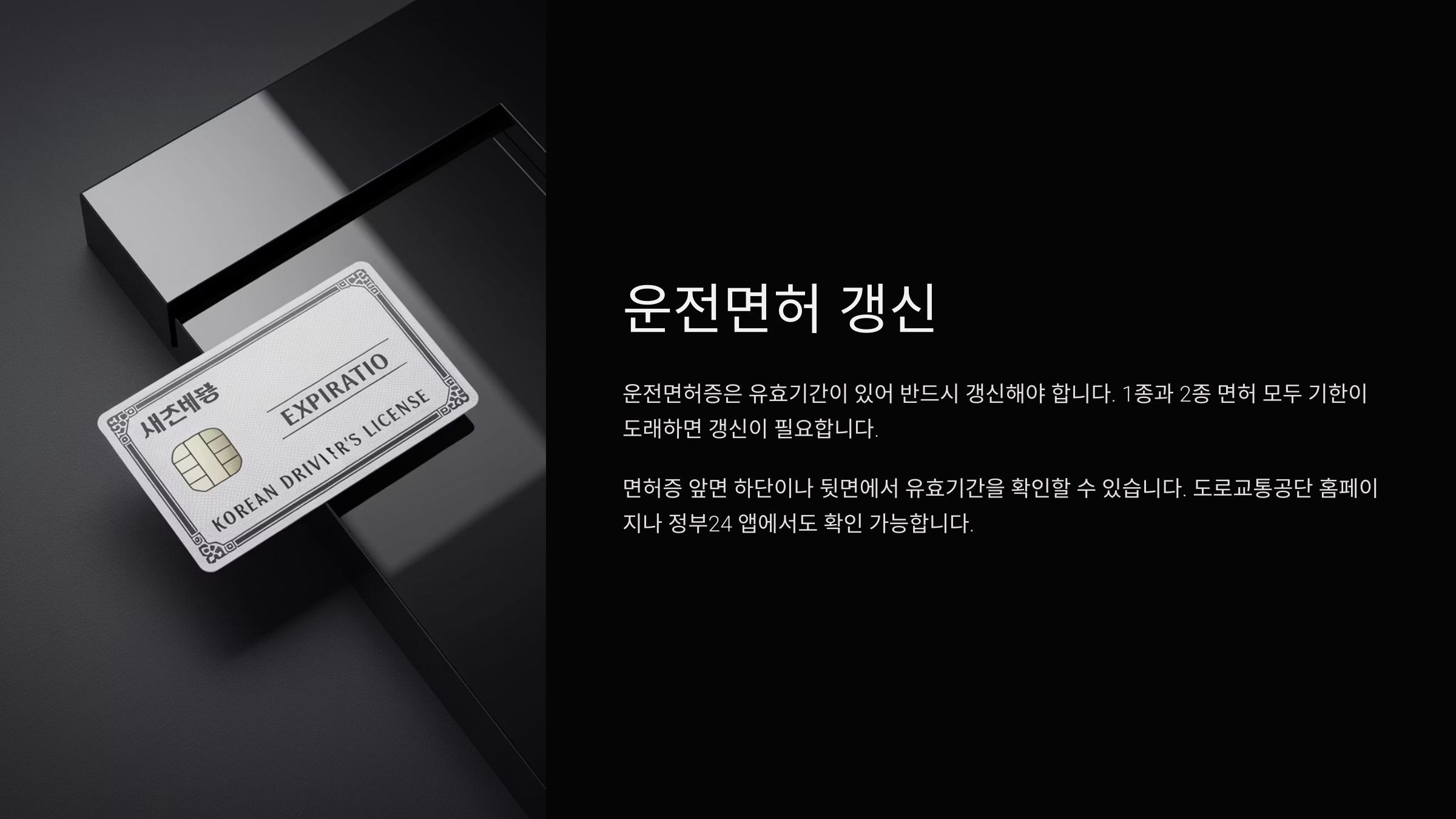 | 면허 갱신 반영 속도 | 1~2일 내 자동 반영 또는 수동 재등록 | 갱신 즉시 연동 (행안부 서버 연계) |