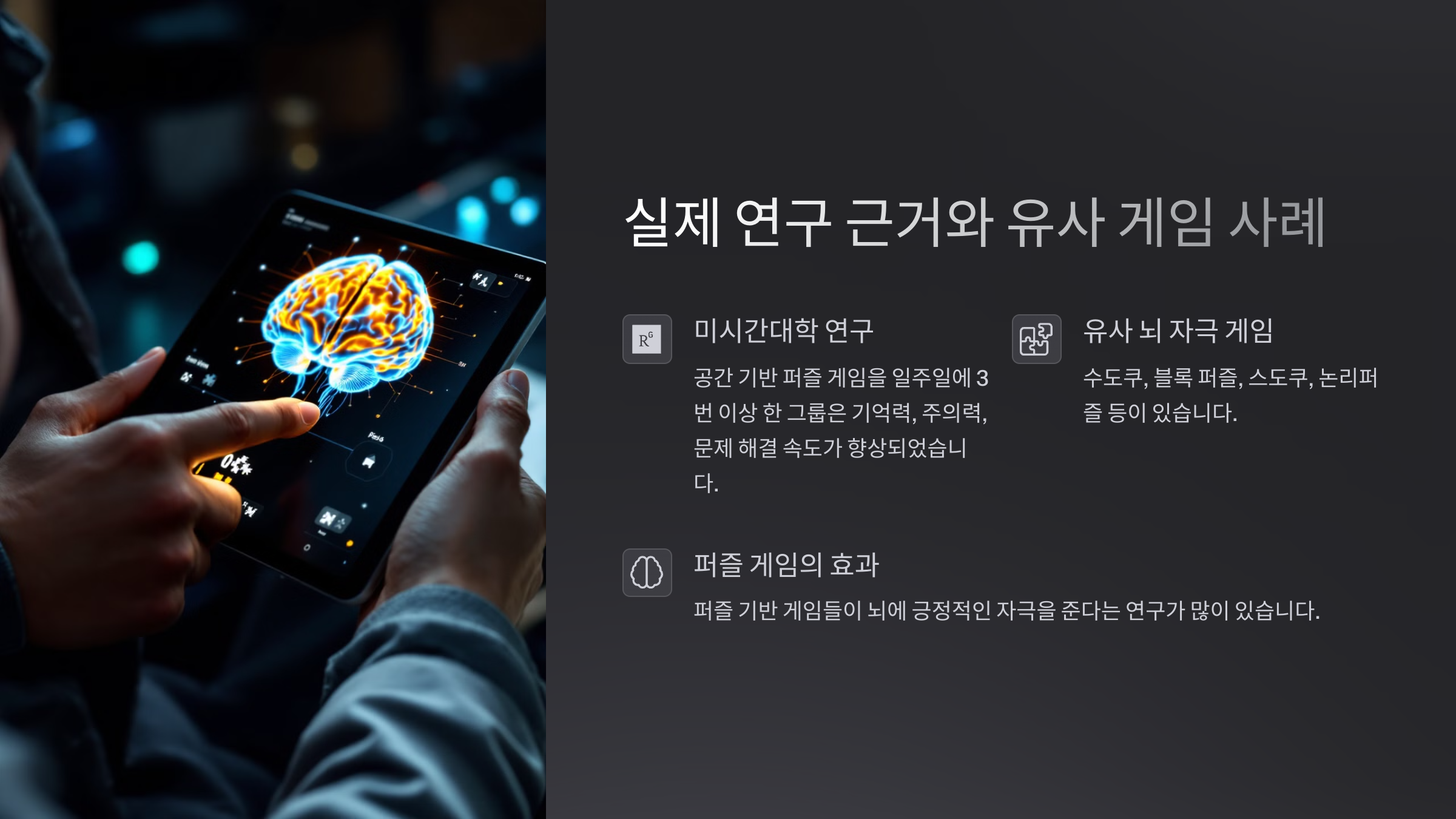 미시간대학 연구에 따르면, 공간 기반 퍼즐 게임을 일주일에 3번 이상 한 그룹은 기억력, 주의력, 문제 해결 속도에서 향상된 수치를 보였어요.