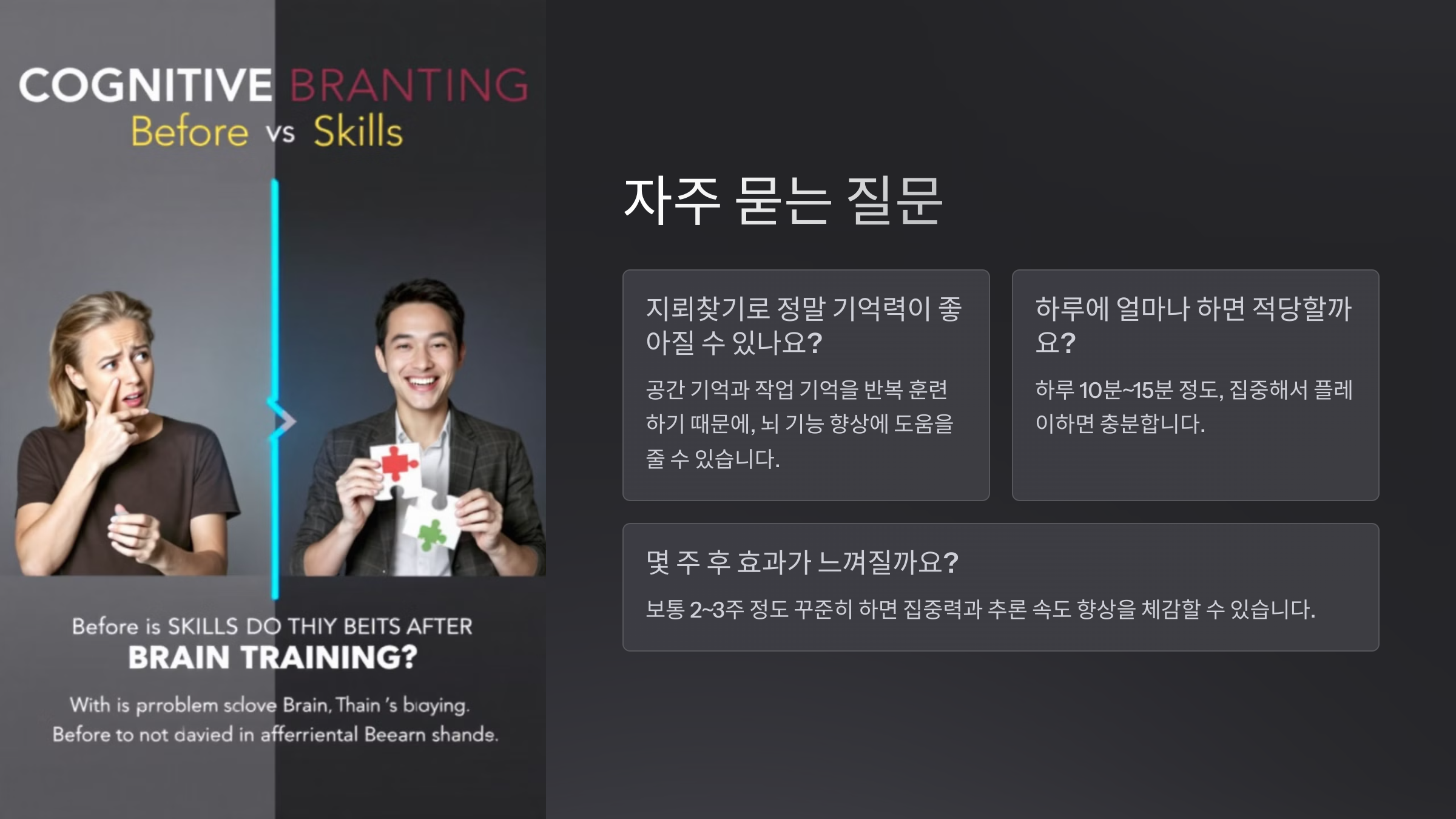 A6. 보통 2~3주 정도 꾸준히 하면 집중력과 추론 속도 향상을 체감할 수 있어요.