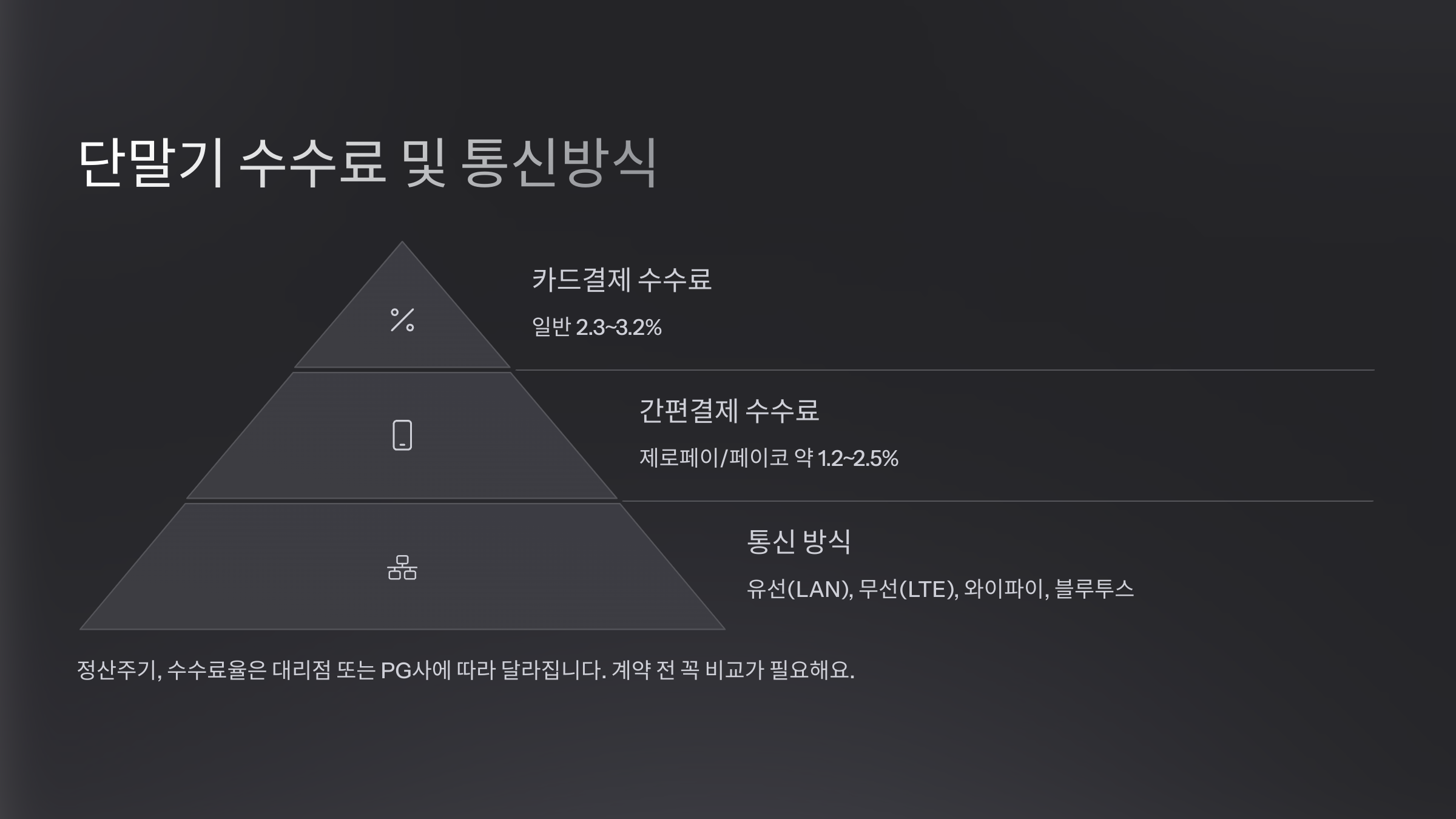 정산주기, 수수료율은 대리점 또는 PG사에 따라 달라지며 계약 전 꼭 비교가 필요해요.