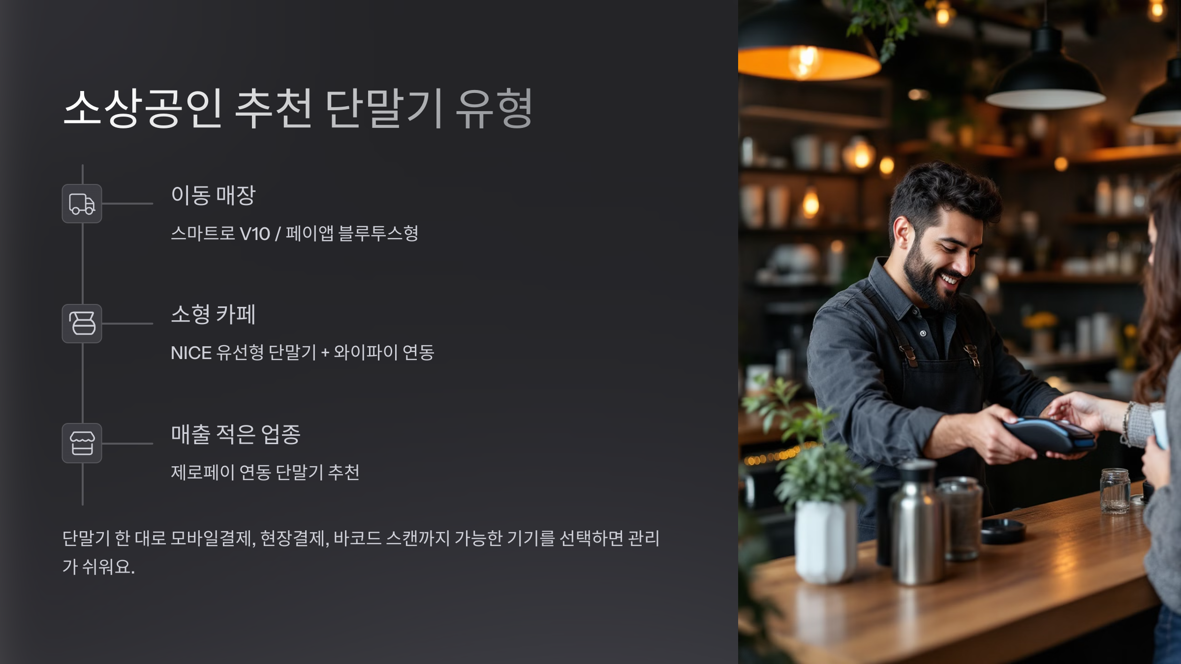 - 소형 카페: NICE 유선형 단말기 + 와이파이 연동