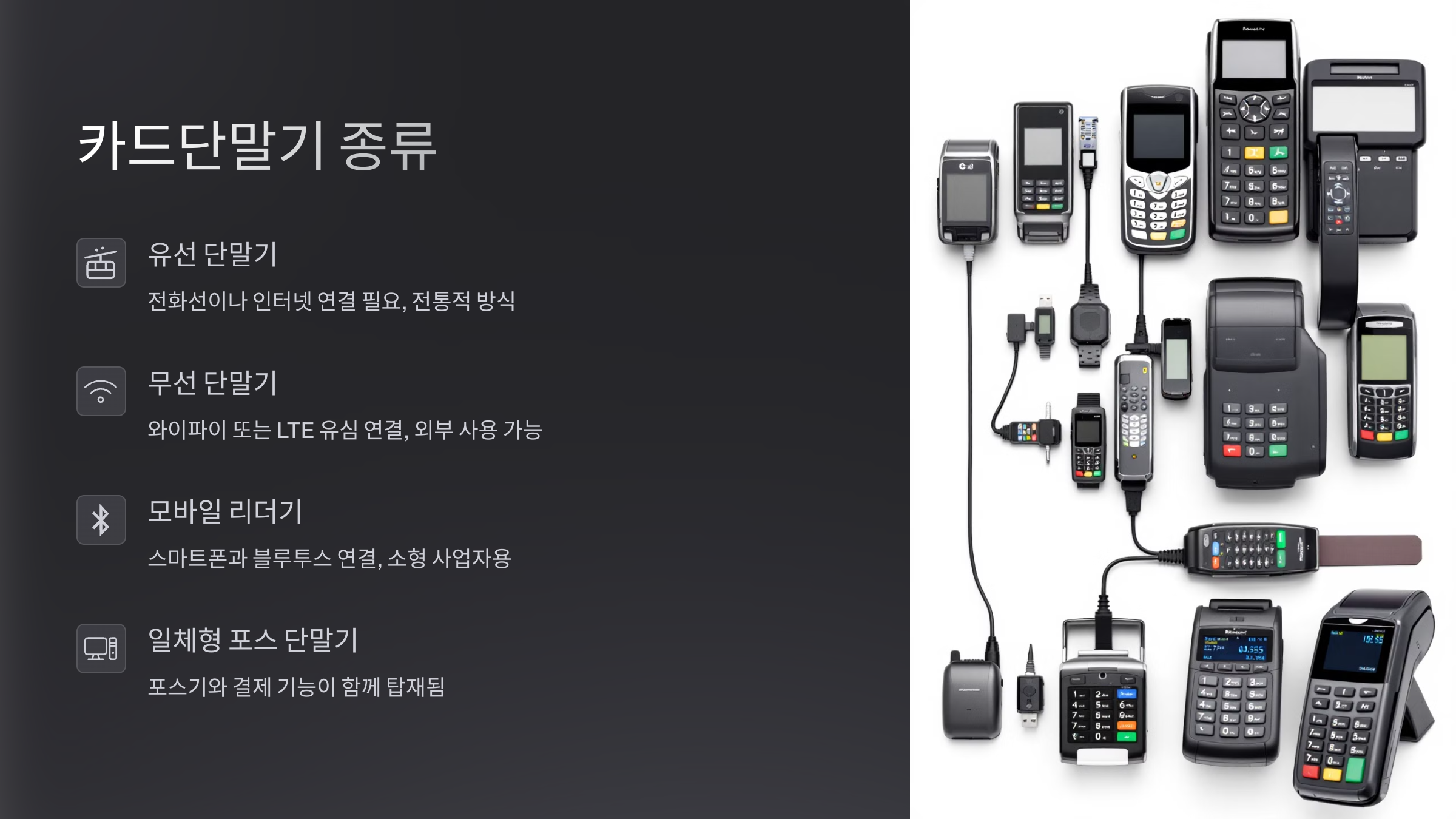 - 유선 단말기: 전화선이나 인터넷 연결 필요, 전통적 방식