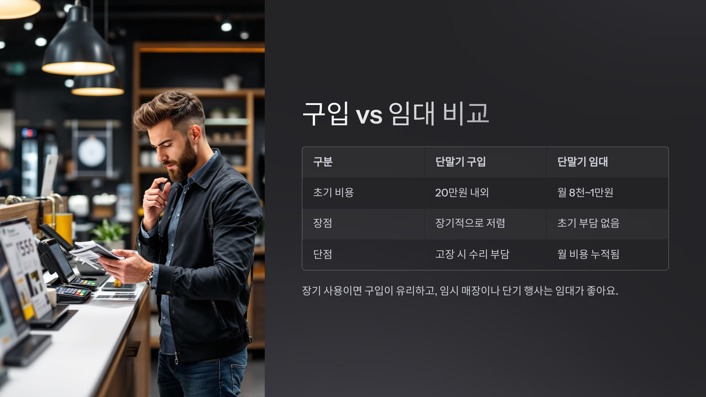 장기 사용이면 구입이 유리하고, 임시 매장이나 단기 행사는 임대가 좋아요.