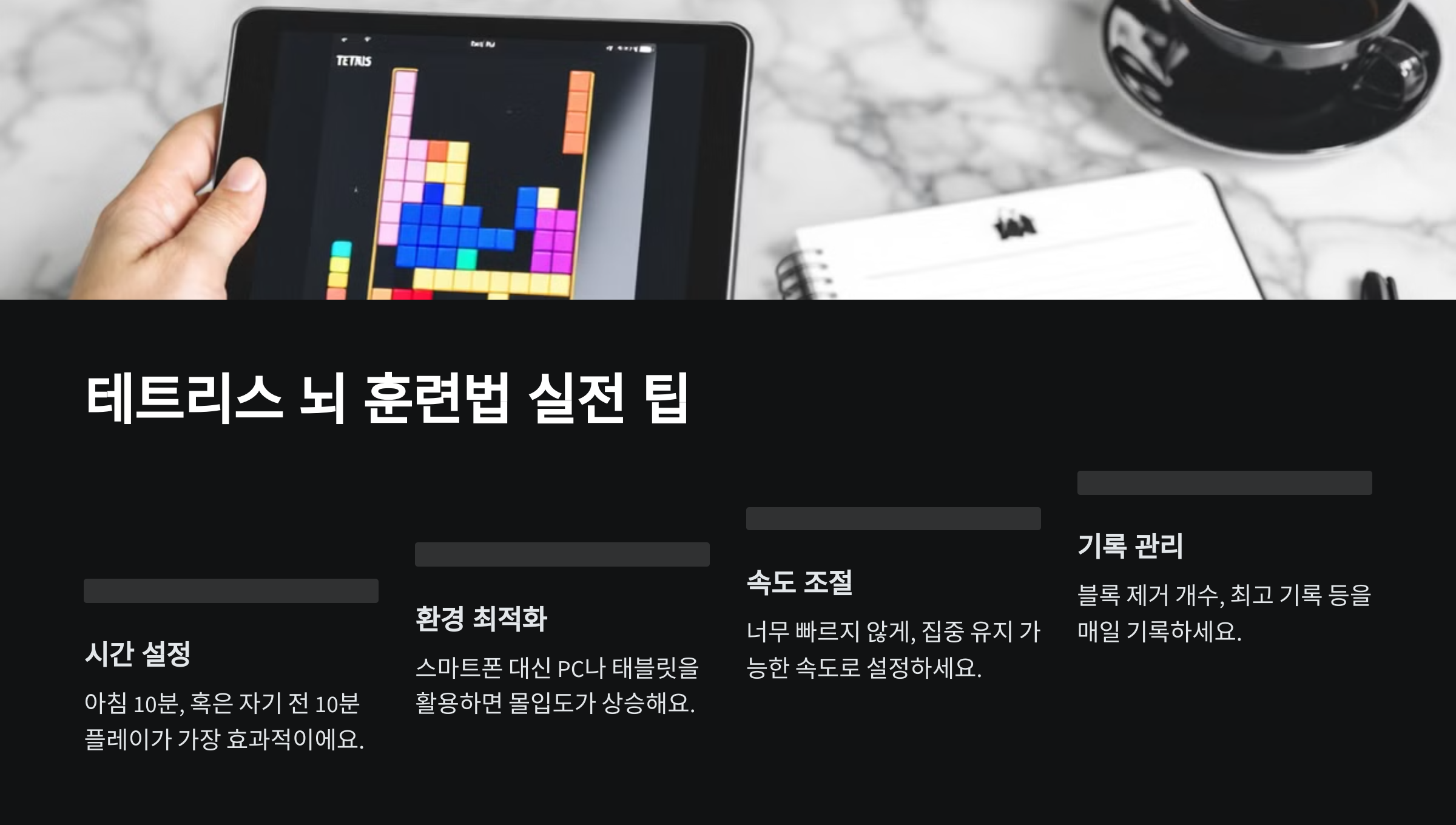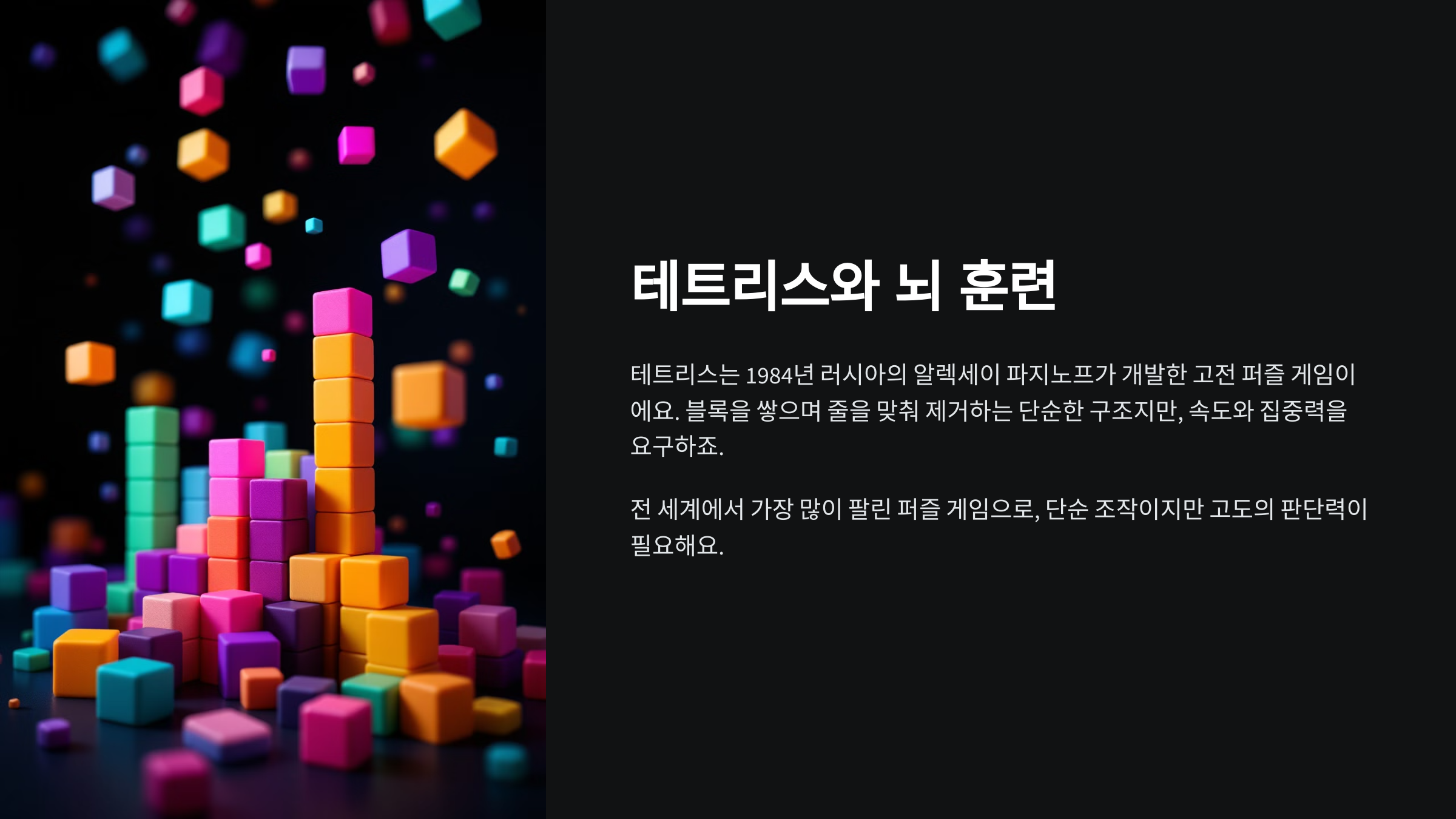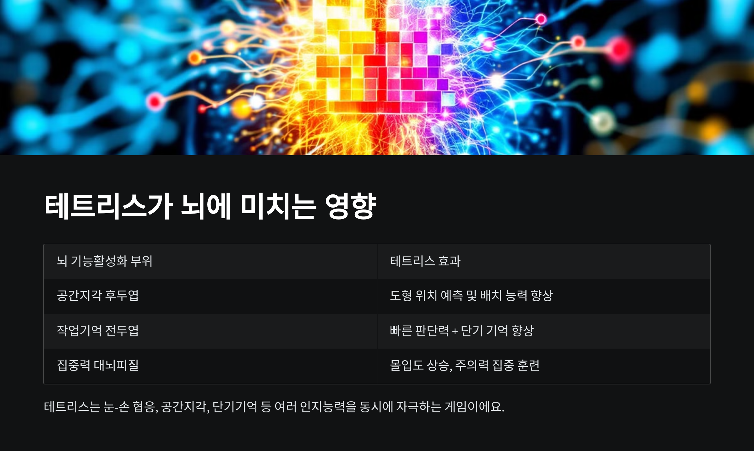 테트리스는 눈-손 협응, 공간지각, 단기기억 등 여러 인지능력을 동시에 자극하는 게임이에요.