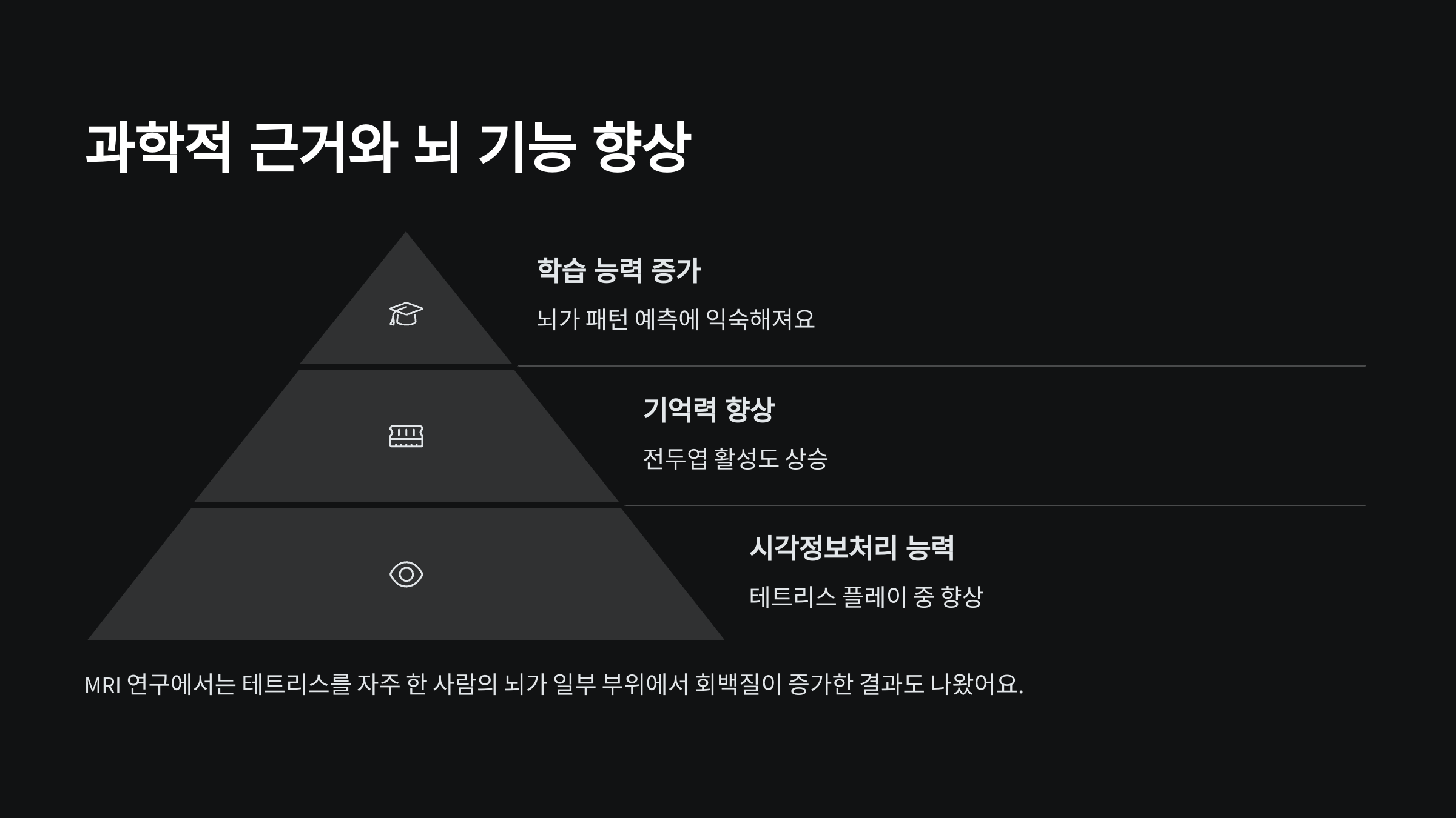 MRI 연구에서는 테트리스를 자주 한 사람의 뇌가 일부 부위에서 회백질이 증가한 결과도 나왔어요.