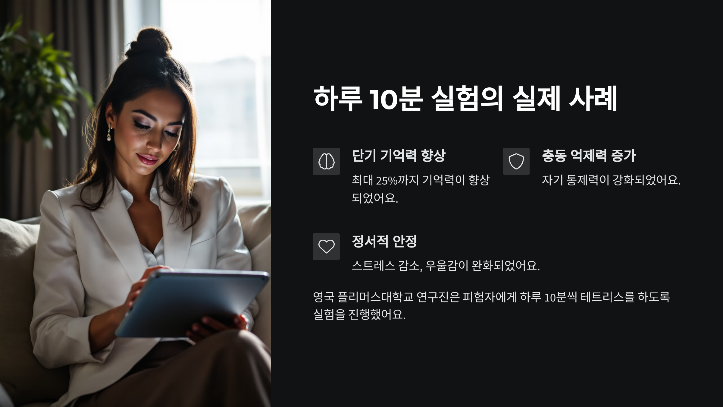 연구에 따르면, 테트리스를 하루 10분씩만 해도 집중력과 공간지각력에 긍정적인 변화가 나타난다고 해요.
