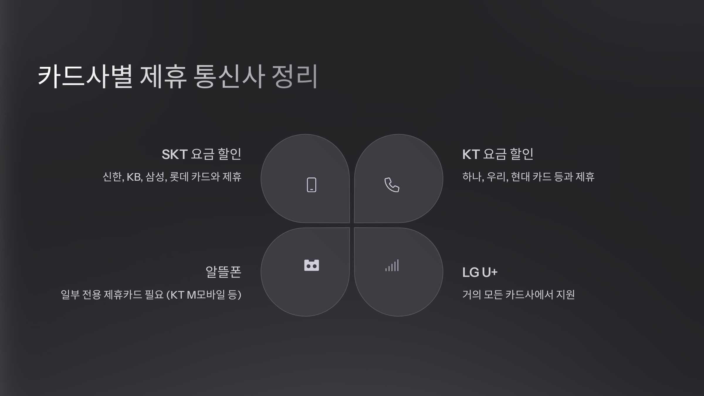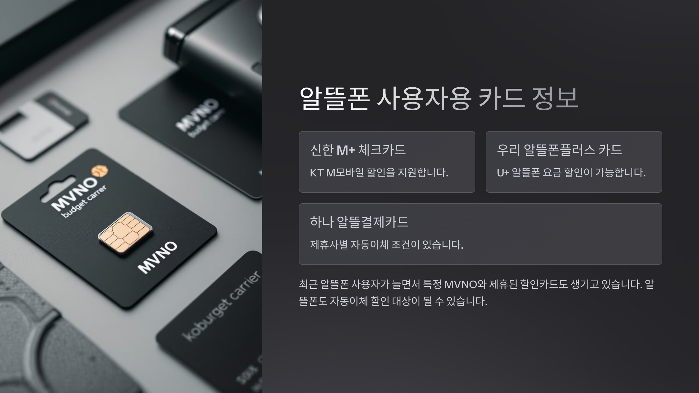 - 알뜰폰 → 일부 전용 제휴카드 필요 (KT M모바일 등)