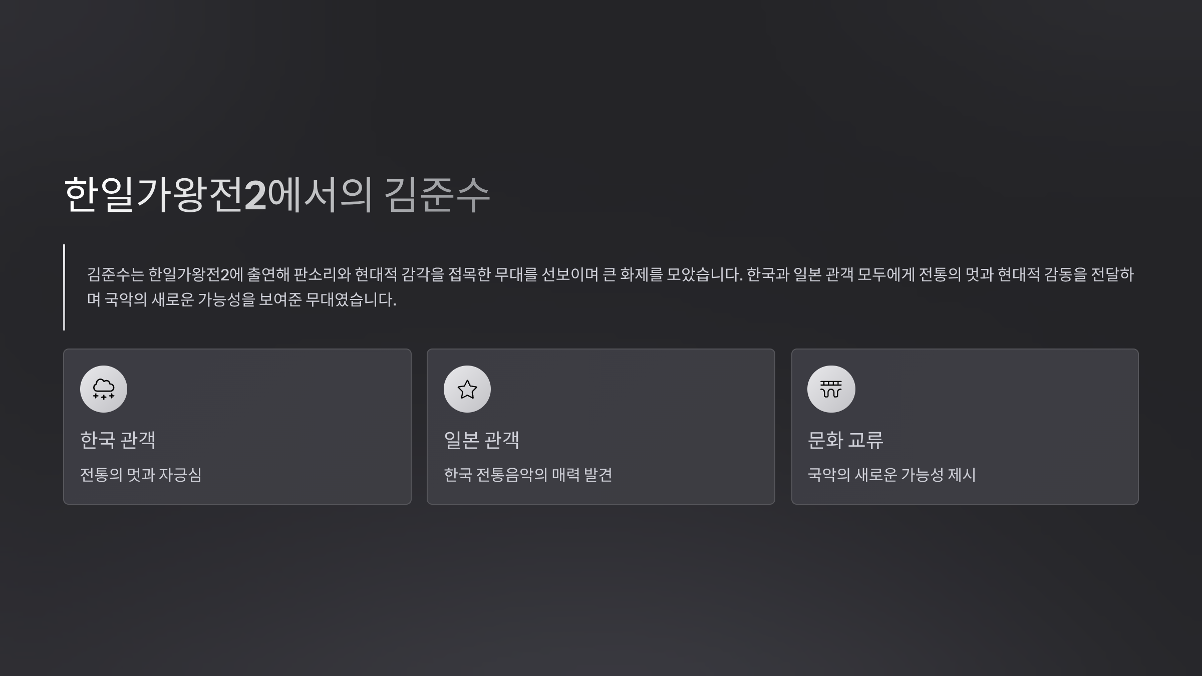 김준수는 한일가왕전2에 출연해 판소리와 현대적 감각을 접목한 무대를 선보이며 큰 화제를 모았어요. 한국과 일본 관객 모두에게 전통의 멋과 현대적 감동을 전달하며 국악의 새로운 가능성을 보여준 무대였답니다.