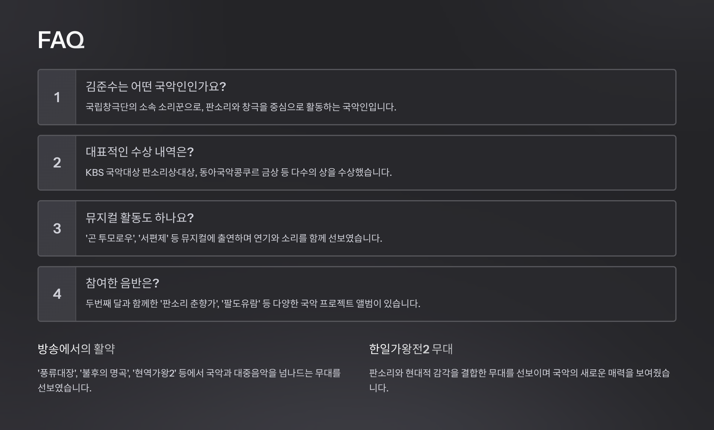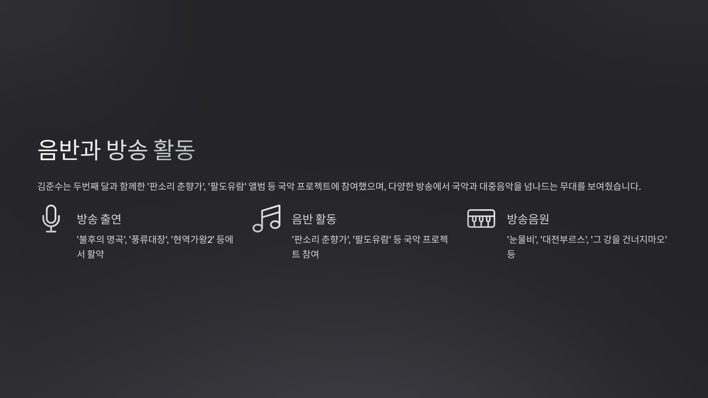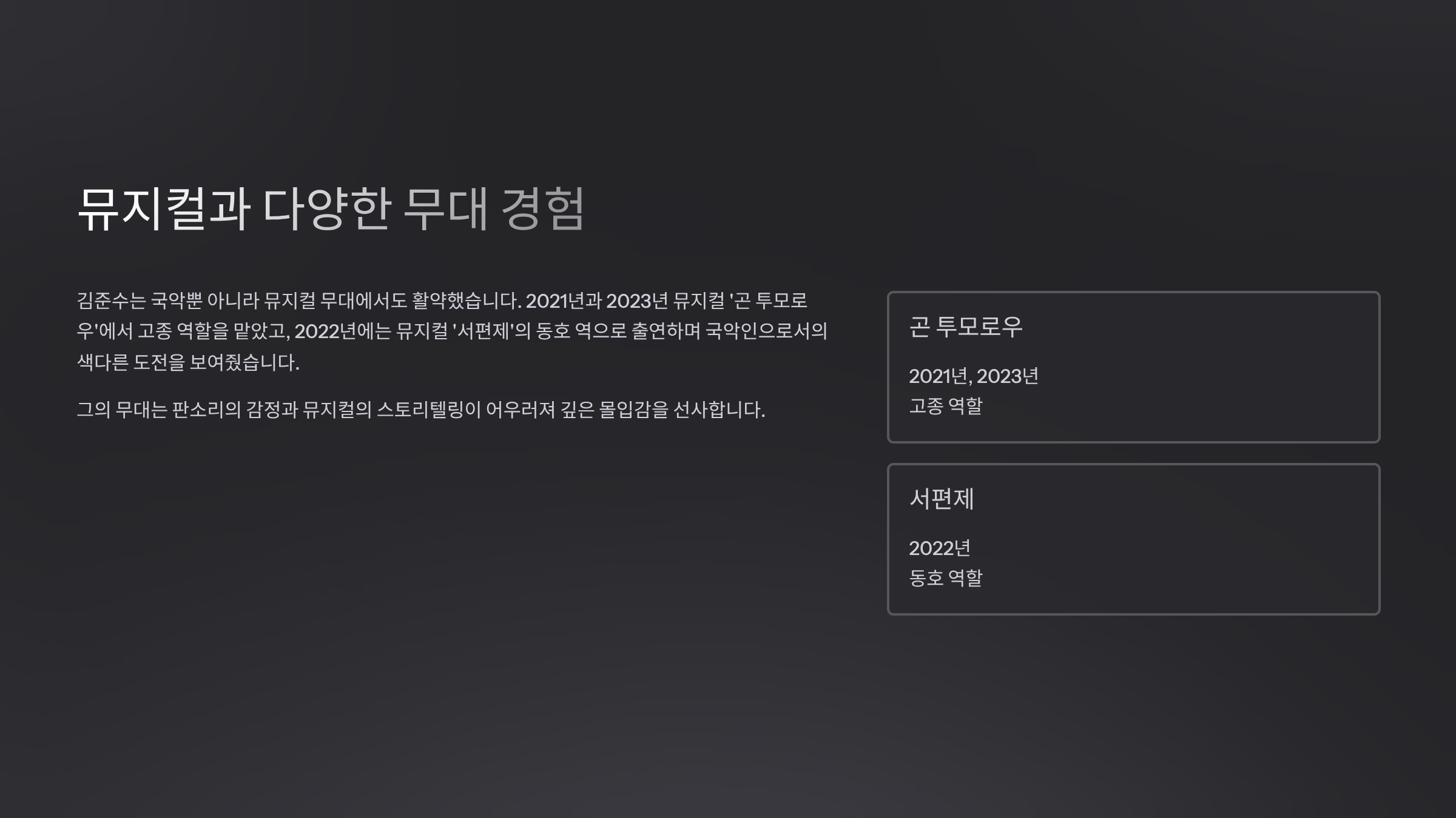 김준수는 국악뿐 아니라 뮤지컬 무대에서도 활약했어요. 2021년과 2023년 뮤지컬 ‘곤 투모로우’에서 고종 역할을 맡았고, 2022년에는 뮤지컬 ‘서편제’의 동호 역으로 출연하며 국악인으로서의 색다른 도전을 보여줬어요. 그의 무대는 판소리의 감정과 뮤지컬의 스토리텔링이 어우러져 깊은 몰입감을 선사해요.