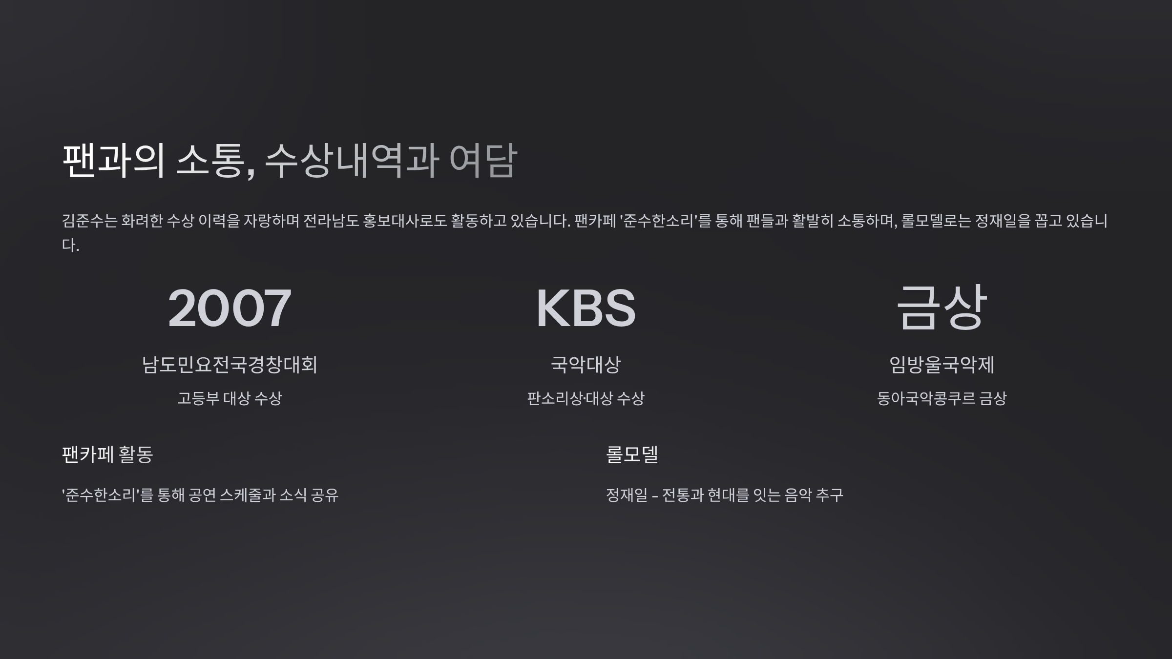 김준수는 2007년 남도민요전국경창대회 고등부 대상을 시작으로, 임방울국악제 금상, 동아국악콩쿠르 금상, KBS 국악대상 판소리상·대상 등 화려한 수상 이력을 자랑해요. 전라남도 홍보대사로도 활동하며 고향에 대한 애정을 드러내고 있죠.