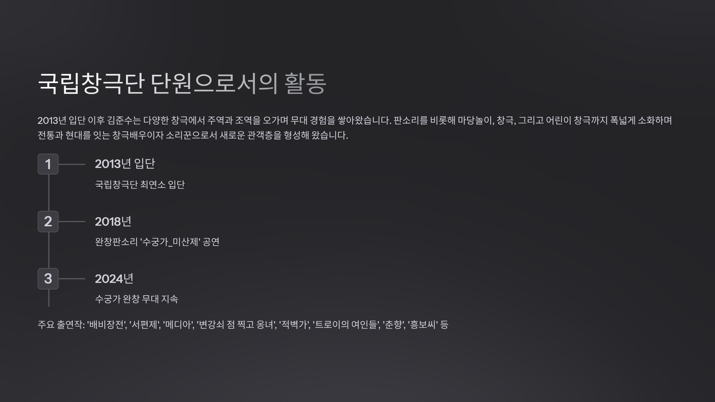 2013년 입단 이후 김준수는 ‘배비장전’, ‘서편제’, ‘메디아’, ‘변강쇠 점찍고 옹녀’, ‘적벽가’, ‘트로이의 여인들’, ‘춘향’, ‘흥보 씨’ 등 다양한 창극에서 주역과 조역을 오가며 무대를 경험했어요. 특히 2018년 완창판소리 ‘수궁가_미산제’ 공연을 통해 그의 내공을 보여줬고, 2024년에도 수궁가 완창 무대를 이어가며 전통 판소리의 맥을 잇고 있어요.