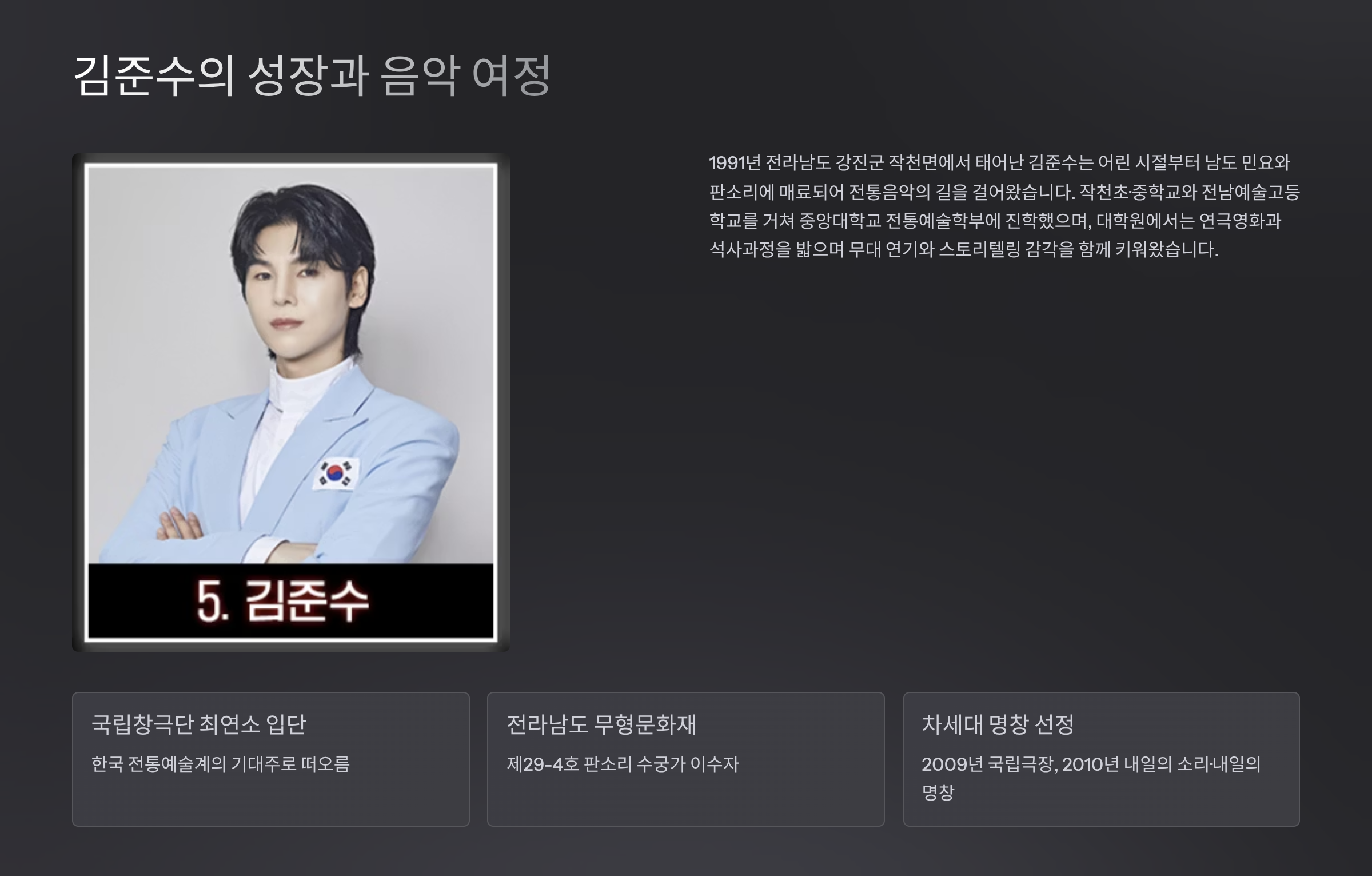 김준수는 전남 강진군 출신으로, 어린 시절부터 판소리와 민요를 접하며 성장했어요. 전남예술고와 중앙대학교 전통예술학부를 졸업하고 현재는 국립창극단의 소속 소리꾼이자 배우로 활동 중이에요. 그는 판소리 명창으로서의 내공과 현대적 감각을 동시에 지닌 국악인으로 평가받고 있어요.