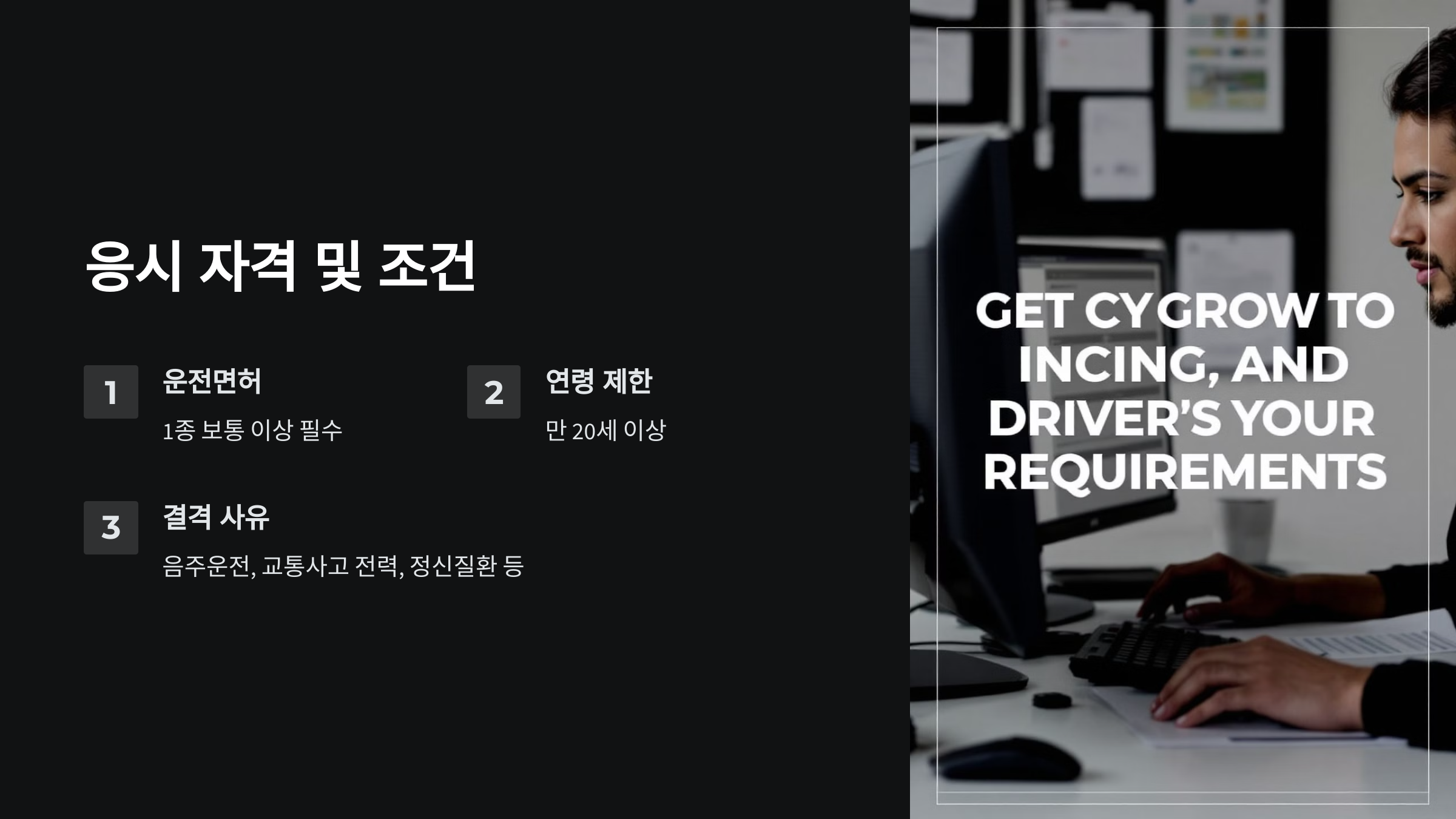 | 결격 사유 | 음주운전, 교통사고 전력, 정신질환 등 |