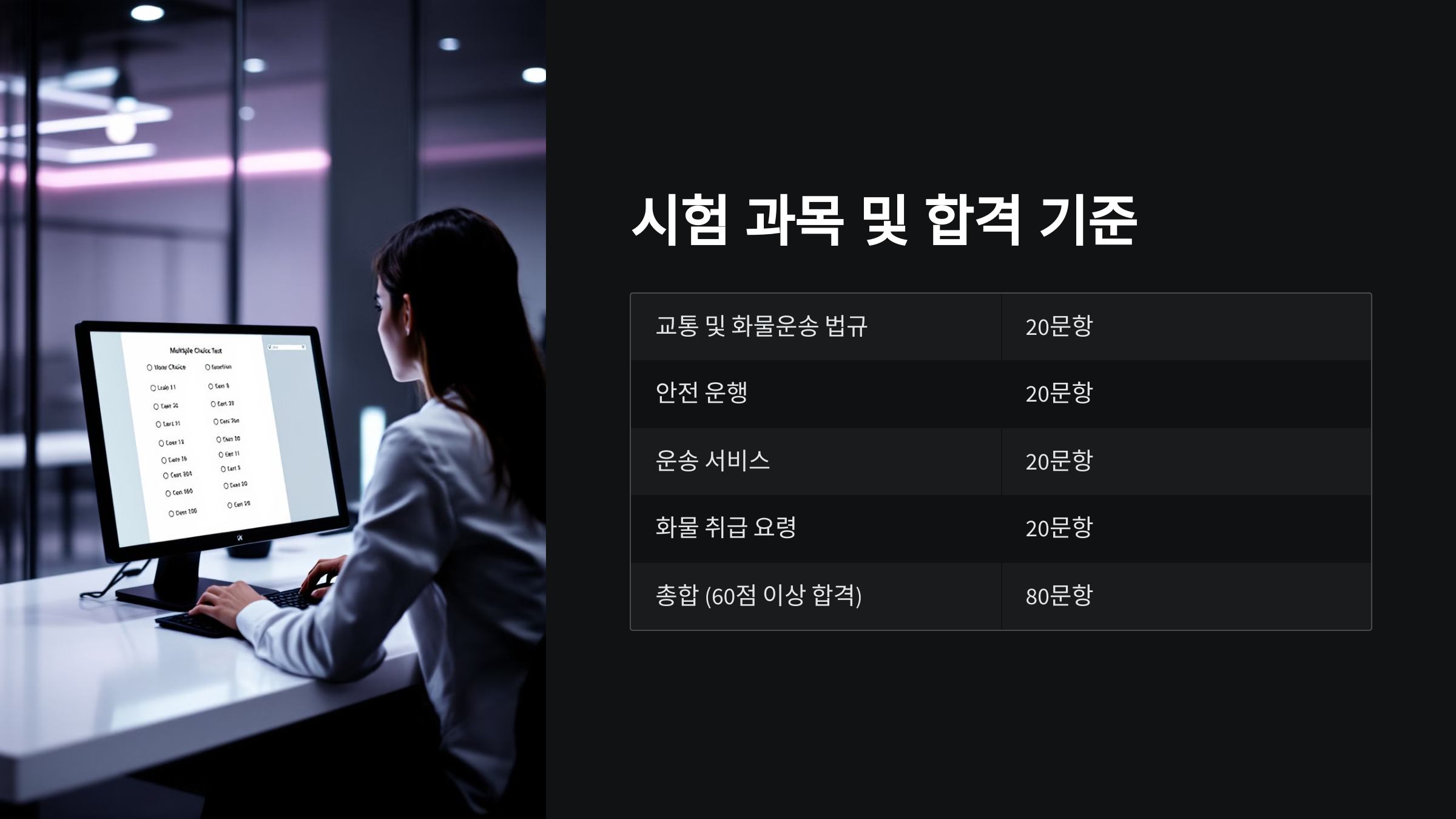 | 교통 및 화물운송 법규 | 도로교통법, 화물자동차운수사업법 등 | 20문항 |