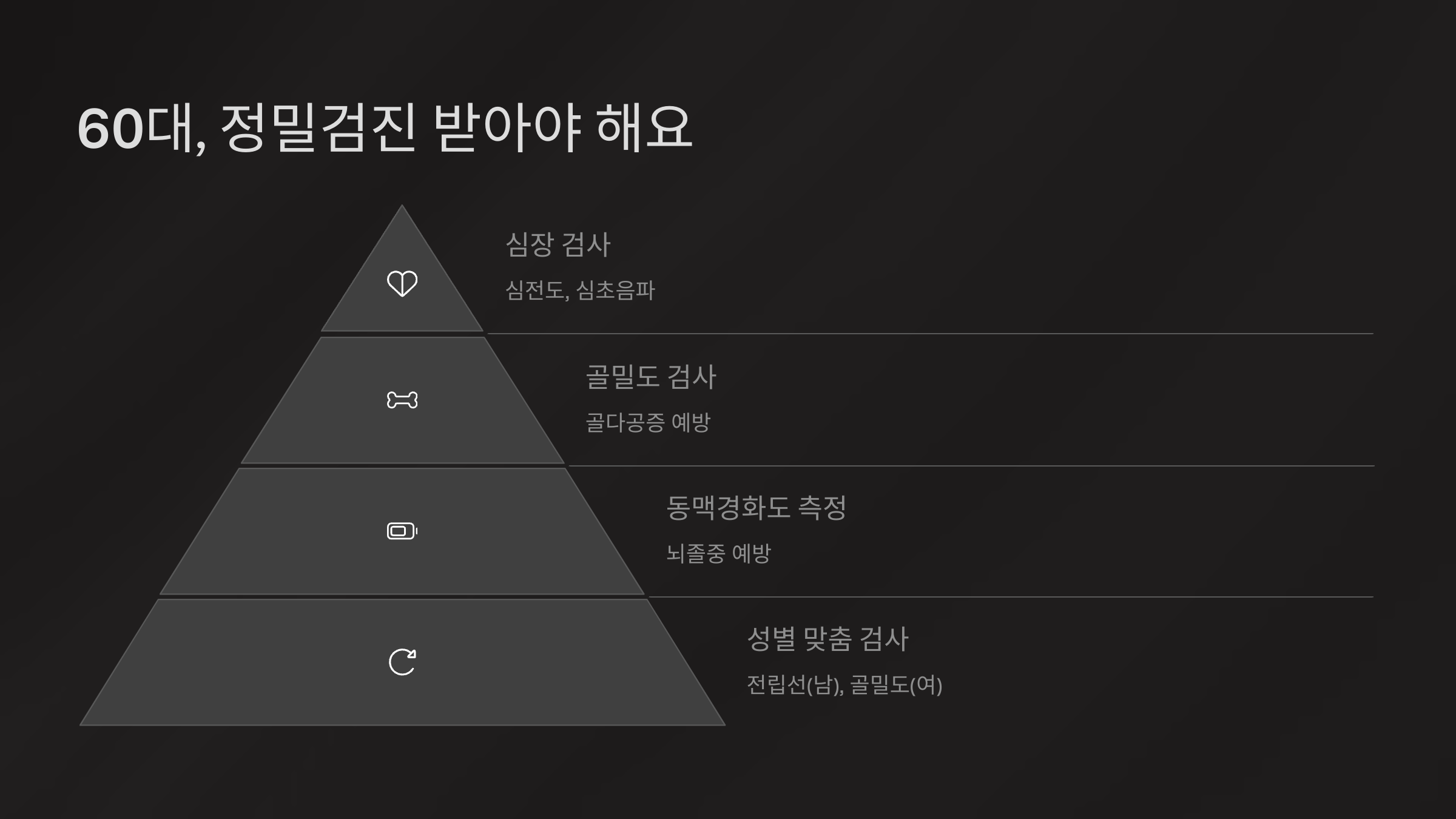 60대는 대부분 만성질환을 이미 가지고 있거나, 복수의 질환이 동반될 가능성이 높아요. 따라서 기존의 검진 항목에 더해 정밀검진까지 고려하는 것이 좋답니다.
