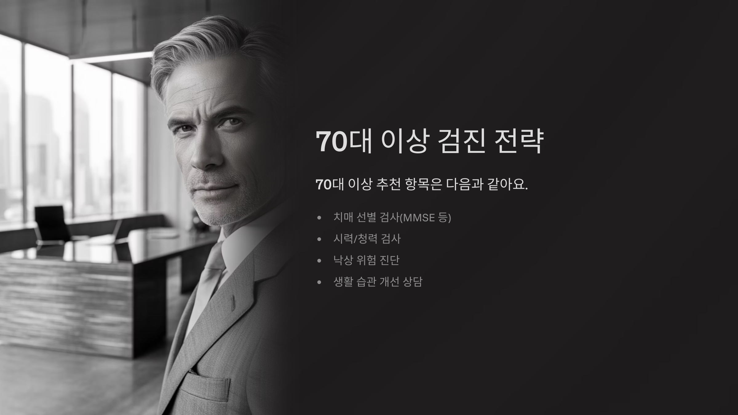 이 시기에는 낙상 위험을 줄이기 위한 근골격계 검사, 치매 조기검사, 시력 및 청력검사도 고려해야 해요.