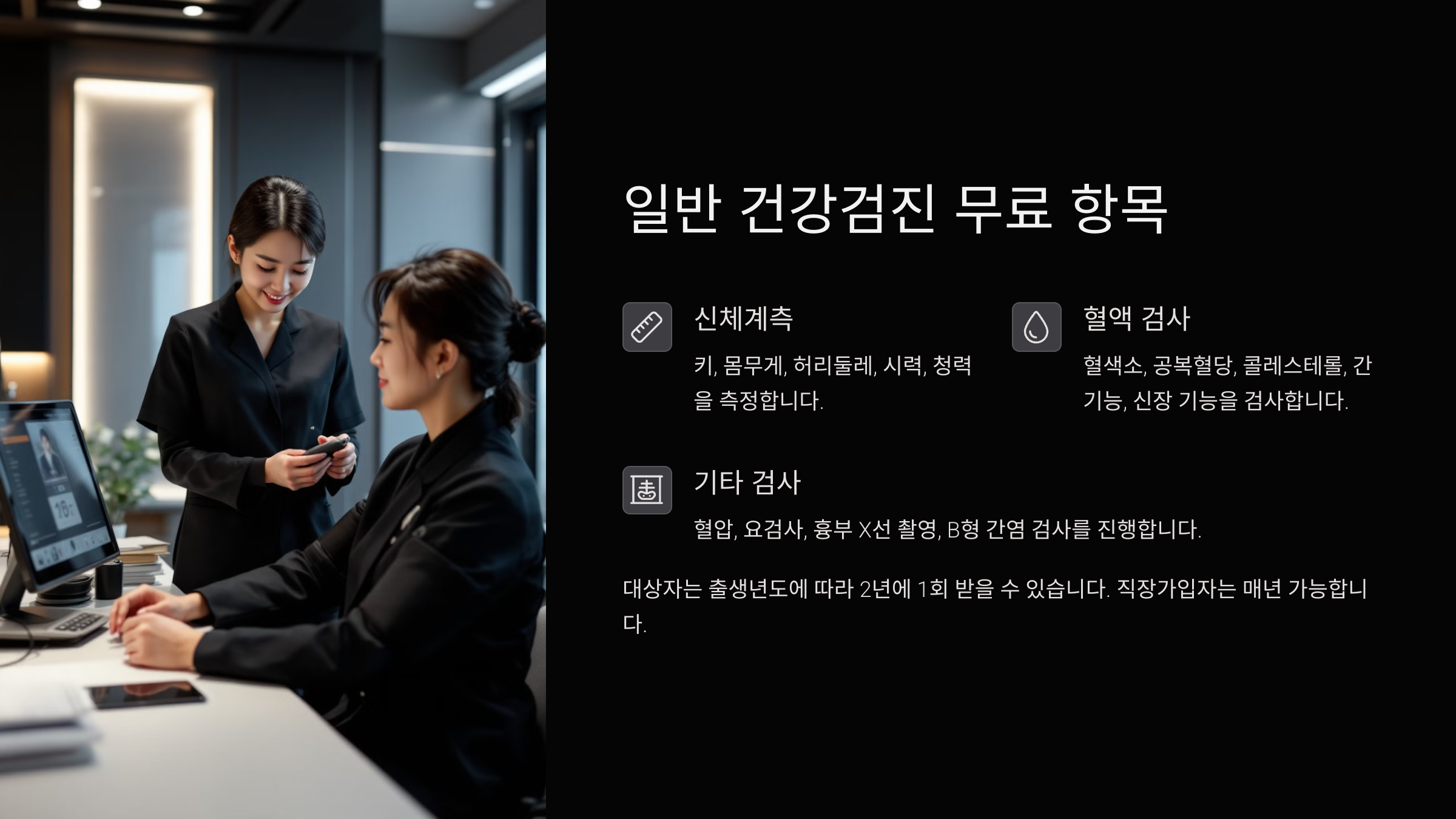 국가에서 제공하는 건강검진은 일정 기준을 만족하면 본인 부담금 없이 무료로 받을 수 있어요. 대상자라면 누구나 해당 연도에 지정된 의료기관에서 검사를 진행할 수 있고, 검사항목도 꽤 다양하답니다.