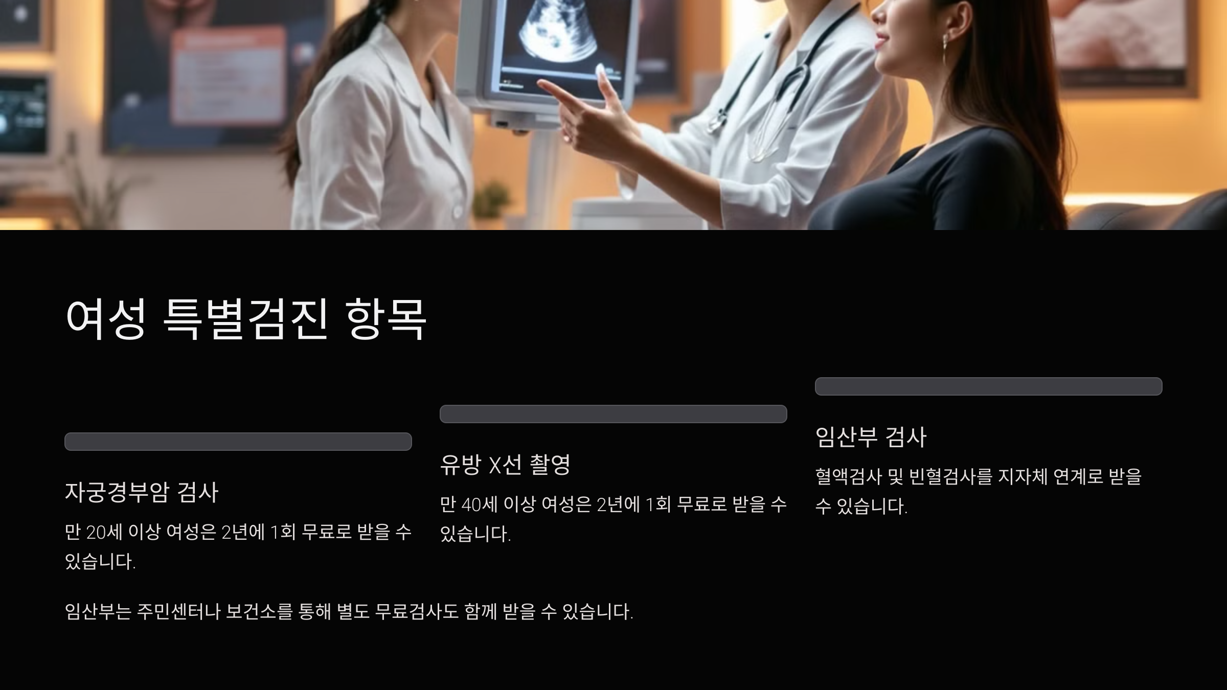 | 30대 | 일반검진, 우울증 검사(만 30세), 자궁경부암(여) |