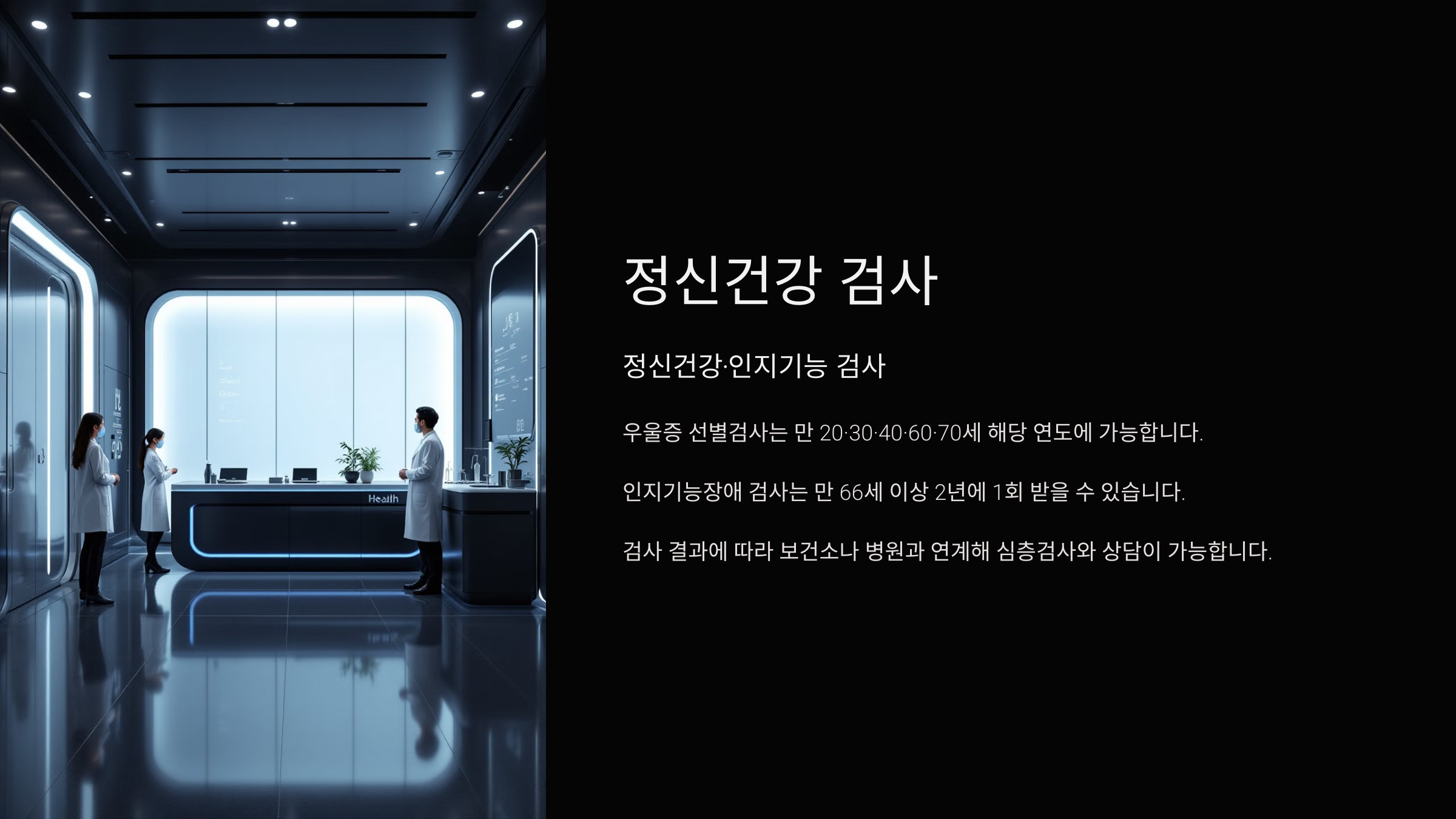 | 70대 이상 | 일반검진, 우울증 검사(만 70세), 인지기능(66세 이후), 암 5종 |