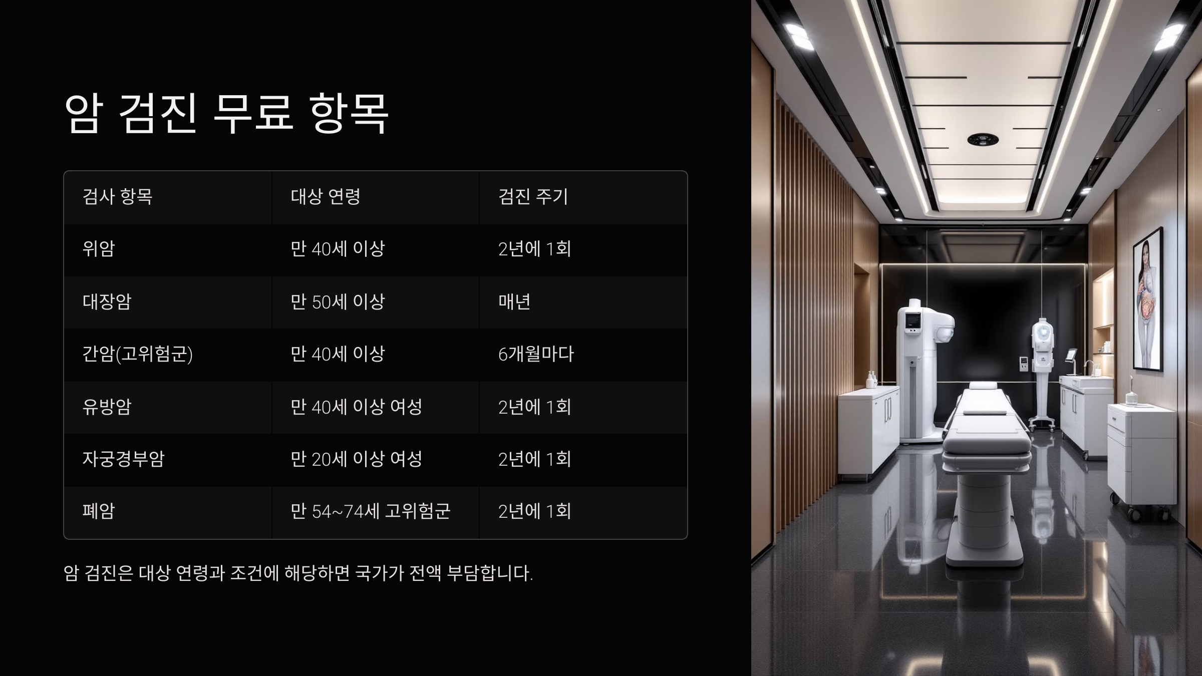 암 검진은 대상이 되는 연령과 조건에 해당하면 검사 비용 없이 국가가 전액 부담해요.