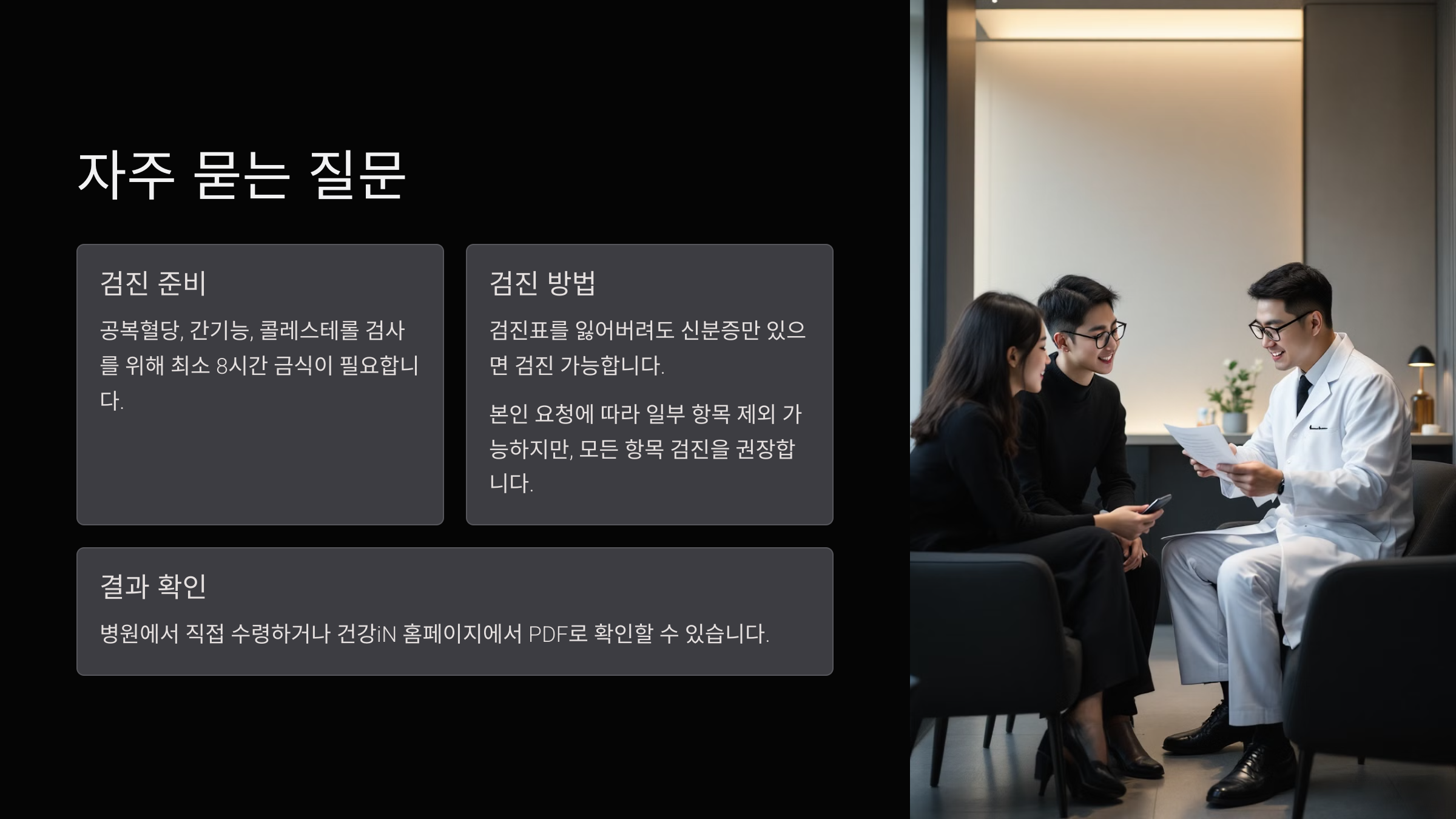 A2. 신분증만 있으면 검진 가능해요. 건강보험공단 홈페이지에서 대상 확인도 가능해요.